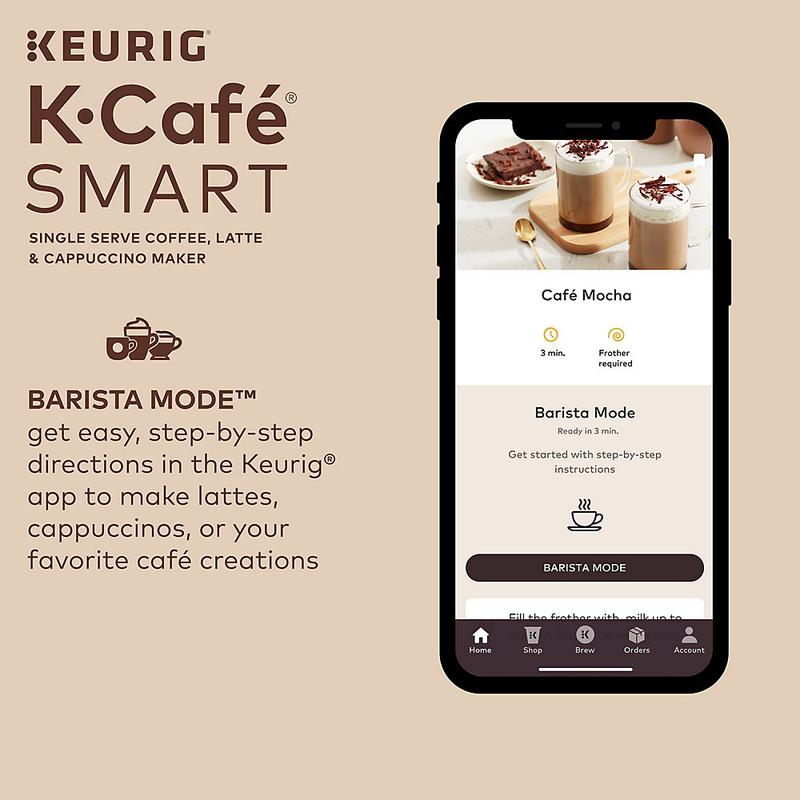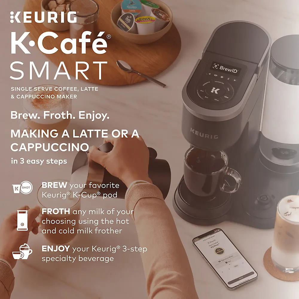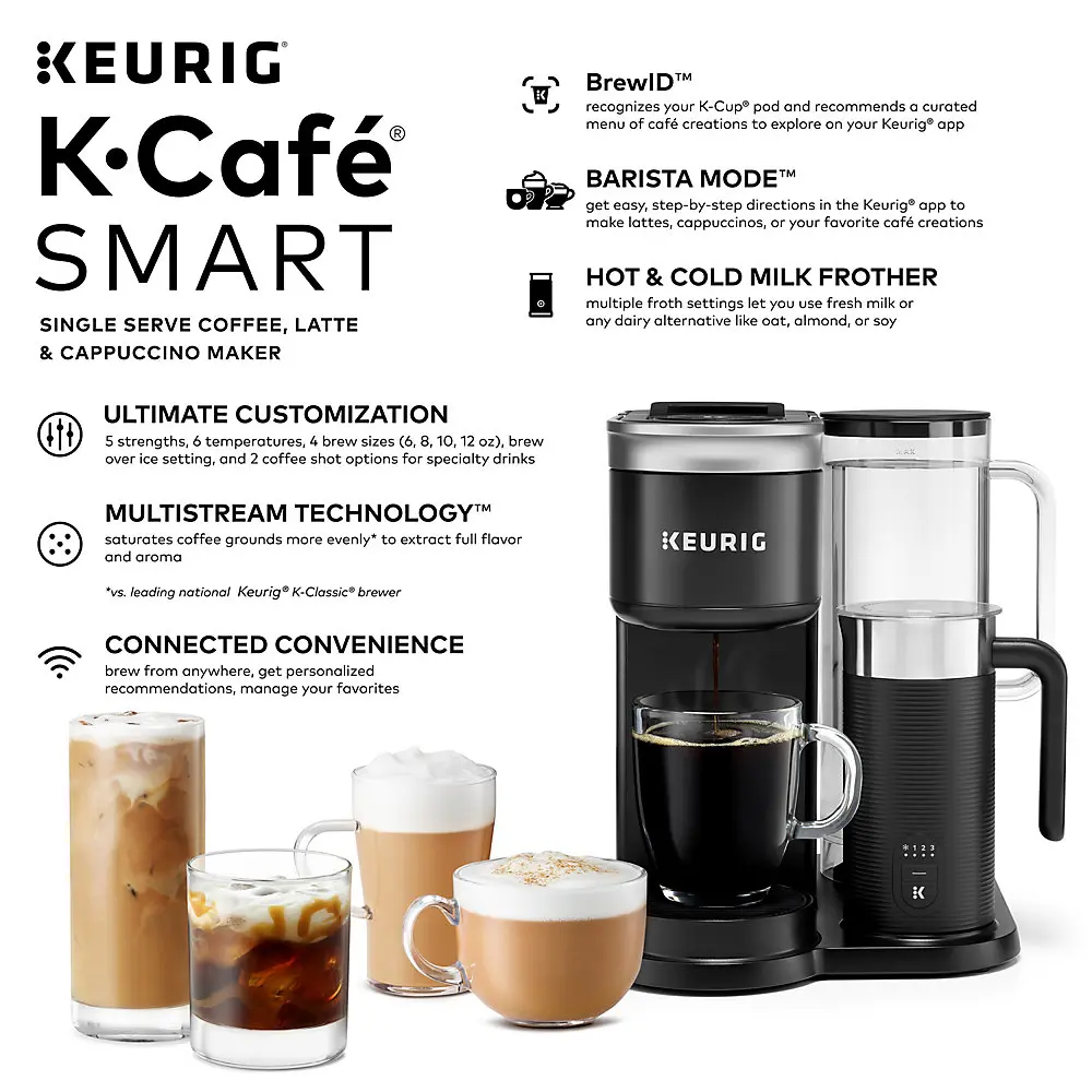 Bring the coffeehouse to your house with the Keurig® K-Café® SMART brewer with BrewID™. Brew full-flavored coffee and create your favorite hot and iced coffeehouse beverages, precisely the way you love them, at home. Using BrewID™ technology and the Keurig® app, the K-Café® SMART brewer recognizes your specific K-Cup® pod and recommends a menu of coffeehouse drinks personalized to your tastes, so you can brew your favorites with precision or discover something deliciously new. Barista Mode™ shows you simple, step-by-step instructions, so it’s easy to make creamy lattes, foamy cappuccinos, delicious macchiatos, and so much more using the built-in hot and cold frother and your choice of milk or dairy alternative. Personalize your perfect cup - hot or iced - with customizable strength and temperature settings and two coffee shot sizes. And the connected convenience of the K-Café® SMART brewer lets you store your favorite settings, schedule brews ahead of time, and brew remotely. Plus, no matter what you’re enjoying - from medium roast coffee to macchiatos - MultiStream Technology™ saturates the grounds more evenly to extract full flavor and aroma every time you brew.* Your favorite coffeehouse beverages. Always simple to make. Always perfectly personalized. Always from the comfort of your own home, with the K-Café® SMART brewer with BrewID™. *vs. leading Keurig® K-Classic® brewer COFFEE, LATTES & CAPPUCCINOS: Brew full-flavored coffee and make delicious coffeehouse beverages using any K-Cup® pod. BrewID™: Recognizes your specific K-Cup® pod and customizes brew settings to make each cup distinctively delicious. CAFÉ CREATIONS: An expertly curated menu of beverages designed for your specific K-Cup® pod. Requires Keurig® app. BARISTA MODE™: View easy, step-by-step directions for your favorite coffeehouse beverages right on your smartphone. Requires Keurig® app. SIGNATURE BREW: Settings created by the coffee experts for the most flavorful brew. COFFEE SHOTS: Brew a concentrated 2 oz or 4 oz coffee shot for more flavorful coffeehouse beverages. HOT AND COLD MILK FROTHER: Features three speeds and one cold setting to froth using milk or dairy alternative. MULTISTREAM TECHNOLOGY™: Saturates the grounds more evenly to extract full flavor and aroma (vs. leading Keurig® K-Classic® brewer). BREW OVER ICE: Brew hot over ice for full-flavored, delicious iced coffee. COMPLETE CUSTOMIZATION: Personalize your cup with five strength settings (from Balanced to Intense) and six temperature settings (from Warm to Max Hot). SIX BREW SIZES: 2 oz and 4 oz coffee shots, plus 6, 8, 10, and 12 oz cups. SMART DELIVERY: The smartest, simplest coffee subscription that knows just what you like and when you need it. CONNECTED CONVENIENCE: Use the Keurig® app to brew from anywhere, schedule a brew, customize your brew settings, create and save favorite settings, and use Voice Assist to brew remotely. The app also works with SMART Delivery to manage your pantry as you brew, so you never run out of your favorite K-Cup® pods. CUSTOM FAVORITE SETTINGS: Save up to 10 custom settings, so it’s easier than ever for everyone in the household to enjoy their favorite cup. 60 OZ REMOVABLE RESERVOIR: Allows you to brew up to seven cups before refilling.