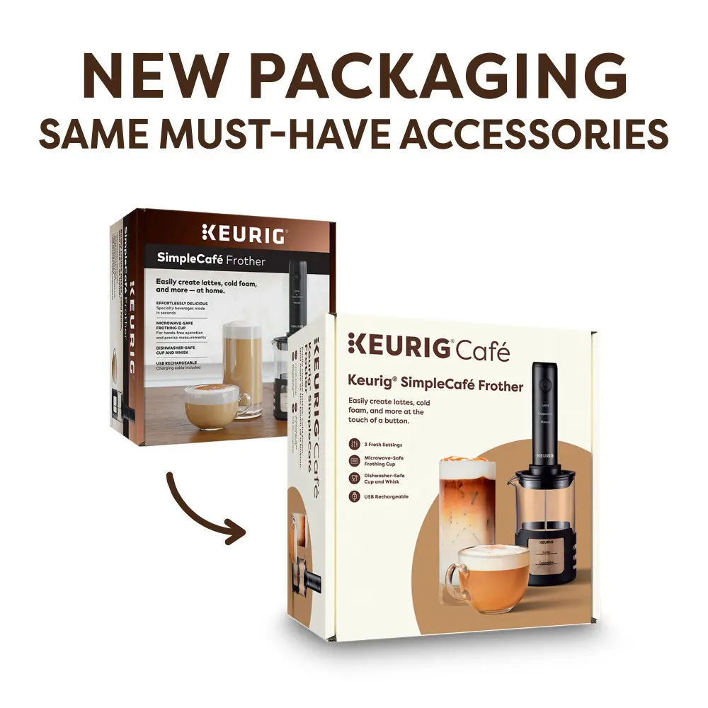 The Keurig® SimpleCafé Frother makes it easy for anyone to create café-style lattes, cappuccinos, and other specialty coffee beverages right at home. This hands-free frother whips up cold or warm milk into a silky froth that makes for delicious iced or hot coffee creations. It comes with a microwave-safe frothing cup with measurement lines to get perfect results every time.
