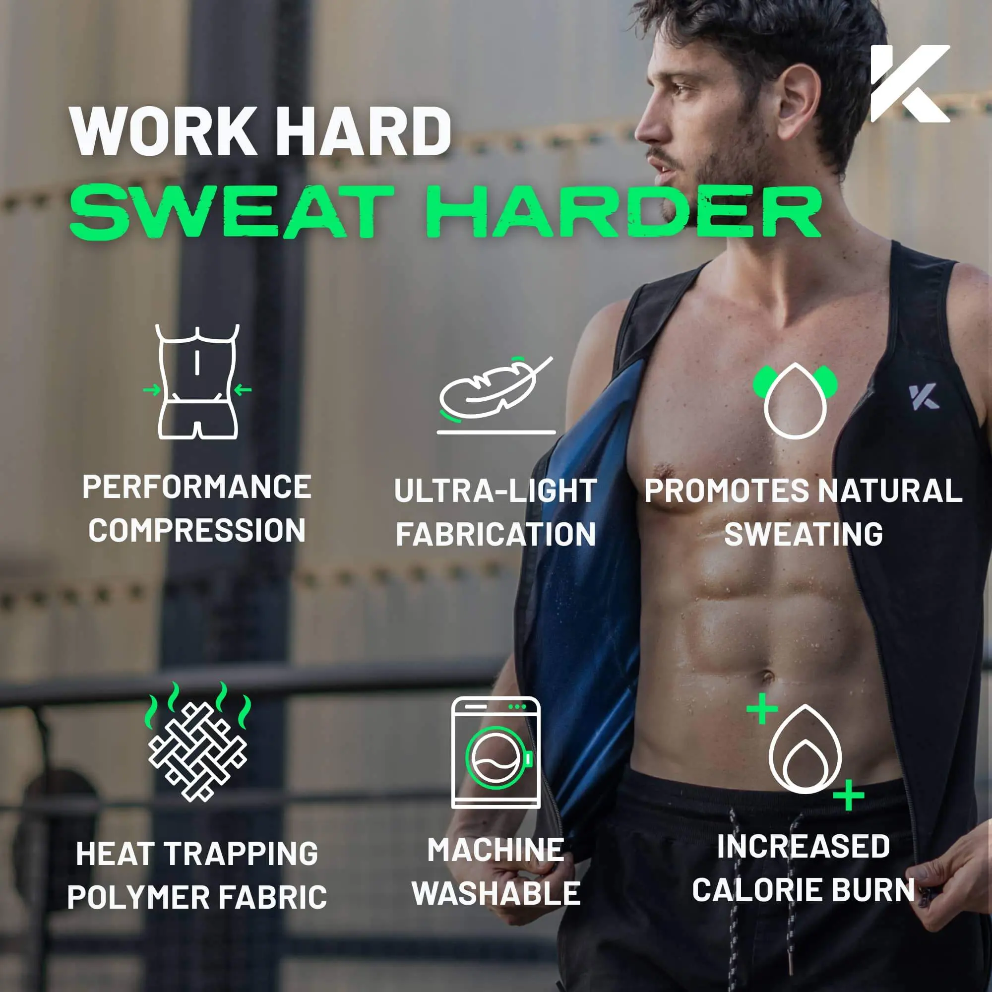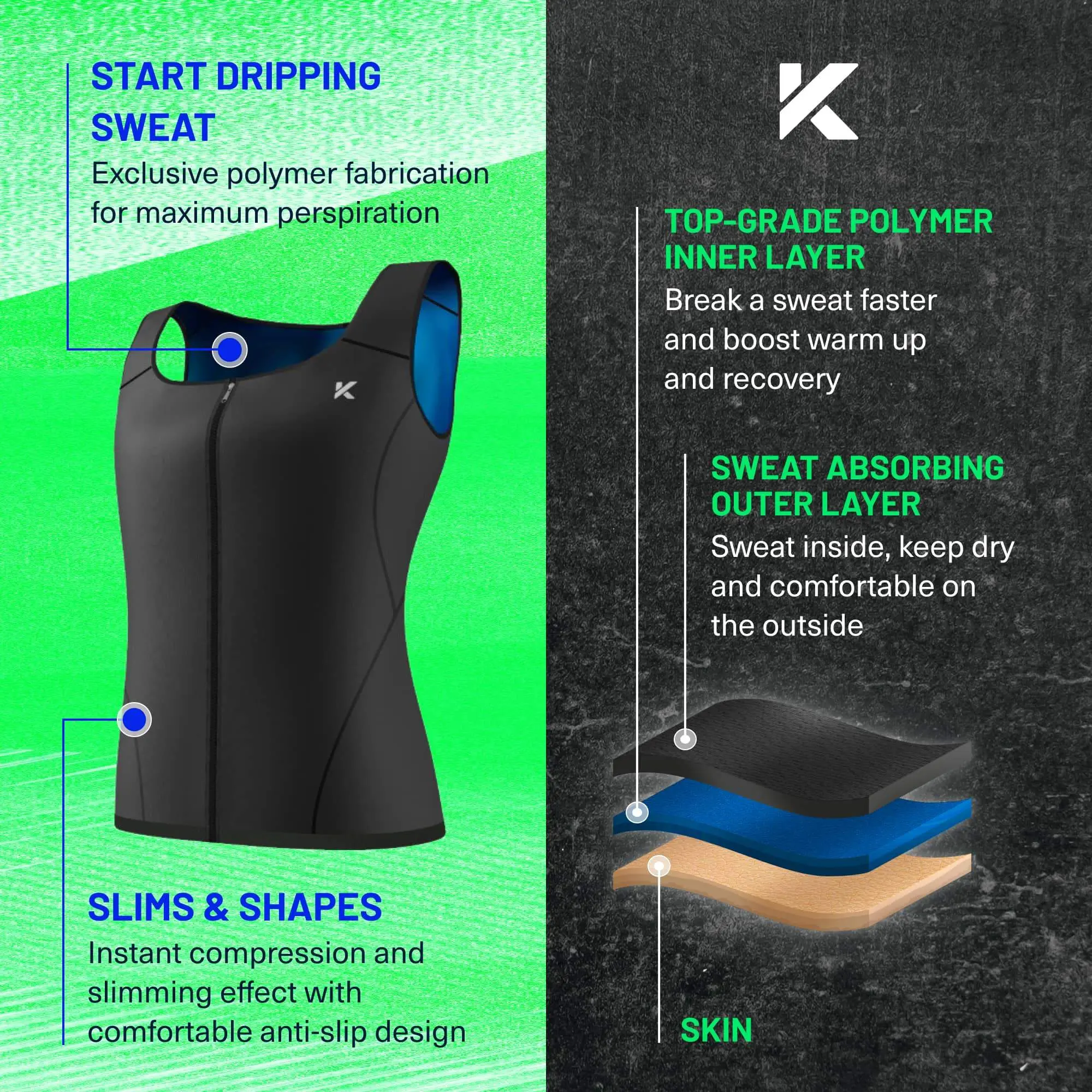 Crafted from high-performance polymer fabric, the vest intensifies sweating for a hot sauna-like experience. The compression technology provides an instantly slimmer appearance while supporting your fitness goals.