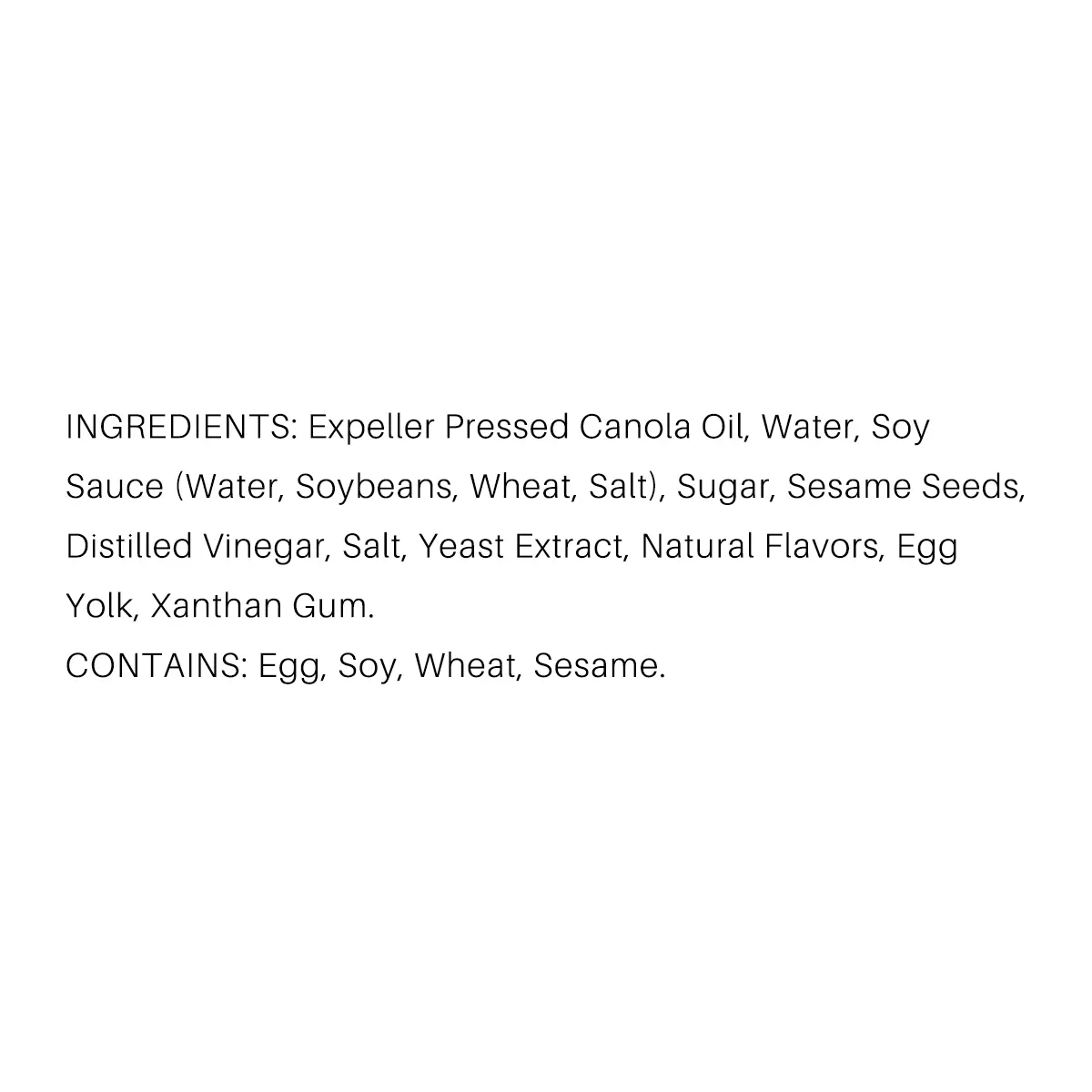 Expeller pressed canola oil, water, soy sauce (water, soybeans, wheat, salt), brown sugar, sesame seeds, distilled vinegar, salt, yeast extract, natural flavors, egg yolk, xanthan gum.