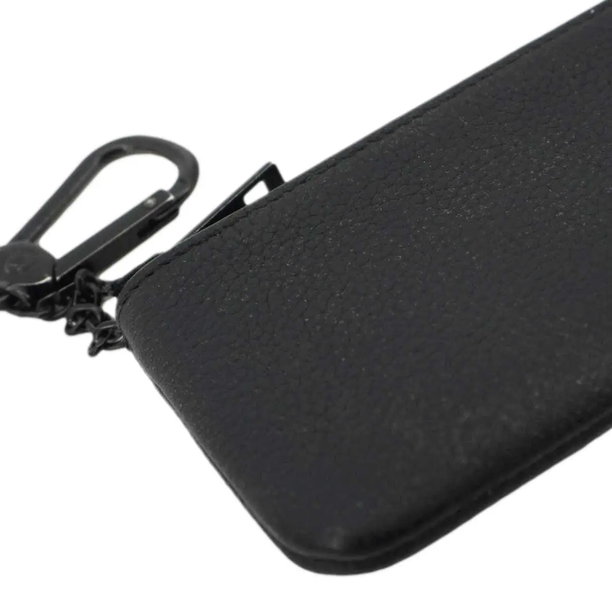 Good—The Item shows signs of including rubbed corners and dirt marks on the leather. The black-colored hardware has light scratches and discoloration on it. Its interior is clean. This pouch does not have any unpleasant smell.