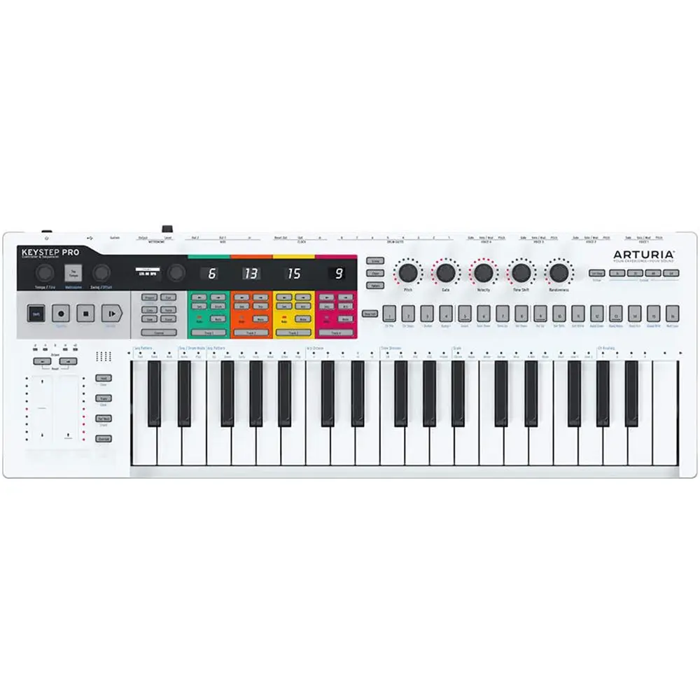 , the Arturia KeyStep Pro is a powerful 4-part polyphonic sequencer with a great feeling 3-ocatve keyboard with velocity sensitivity and aftertouch, making it well suited for producers, musicians, and artists looking to sequence and perform musical ideas in an expressive and articulated way. With an ever-growing collection of modular gear, analog synthesizers, drum machines and software instruments, the KeyStep Pro allows you to perform and control in perfect unison. There are four independent sequencers, controlling whatever synth, module, or drum machine you want. The sequencer features 16 patterns per track, and each pattern can be up to 64 steps long and contain 16 notes per step. Up to 16 patterns can chained together to create a whole song or sections of a live set. What's more, the onboard scene memory takes snapshots of all the sequences within a pattern, letting you instantly switch between sets of sequences. Everything is saved to a project, which can be loaded, duplicated, tweaked, edited, and re-saved again. There are 4 CV, Gate and Mod outputs, 8 dedicated drum Gate outputs, Clocks, MIDI in, 2 MIDI outs, a solo metronome output, sustain input to let you get expressive with your performance, and USB for easy power and DAW/softsynth control. If you like working in the box, the KeyStep Pro easily sequences and arpeggiates your virtual instruments, syncing everything with your software studio. Switch to the dedicated Control mode to control parameters in your favorite synths and effects.