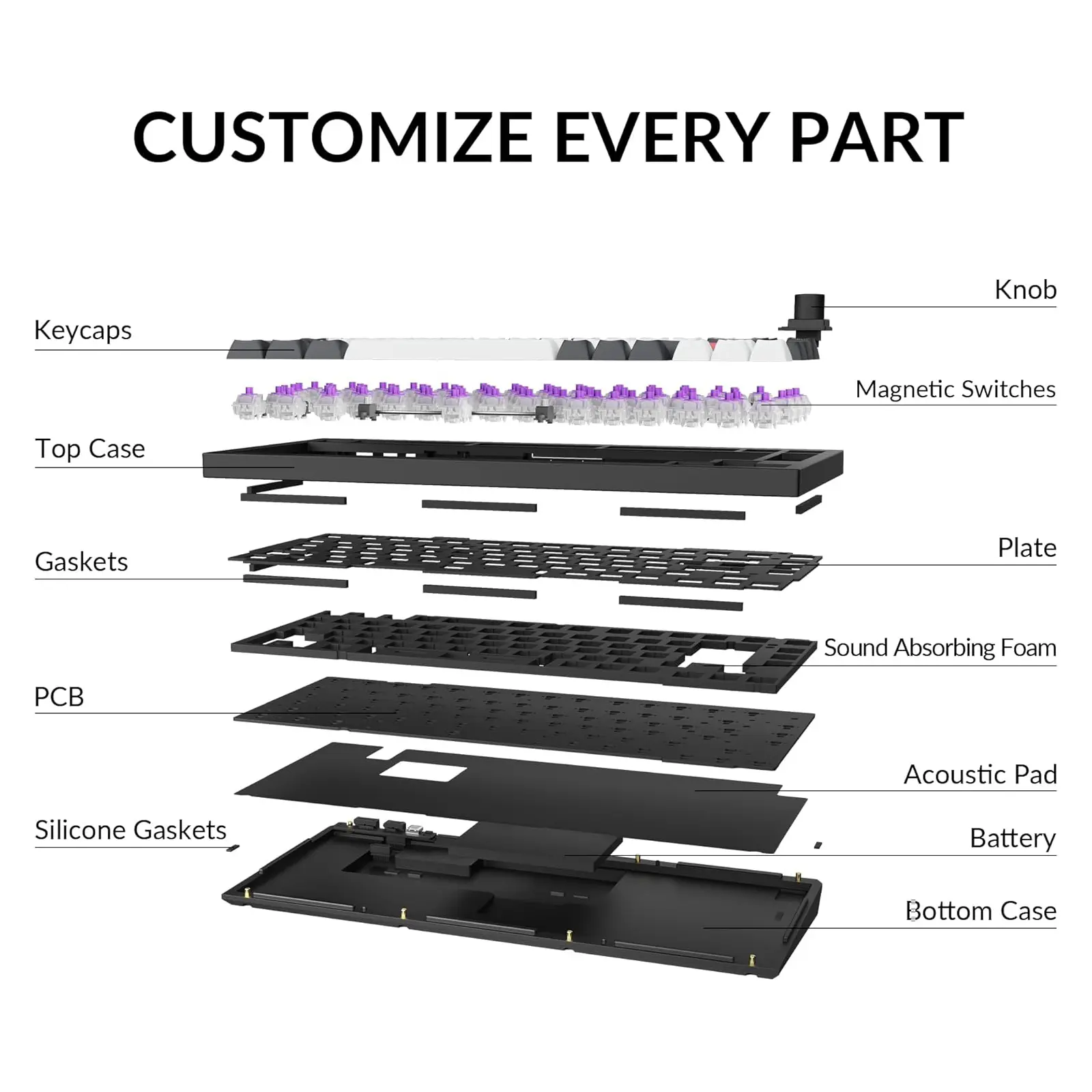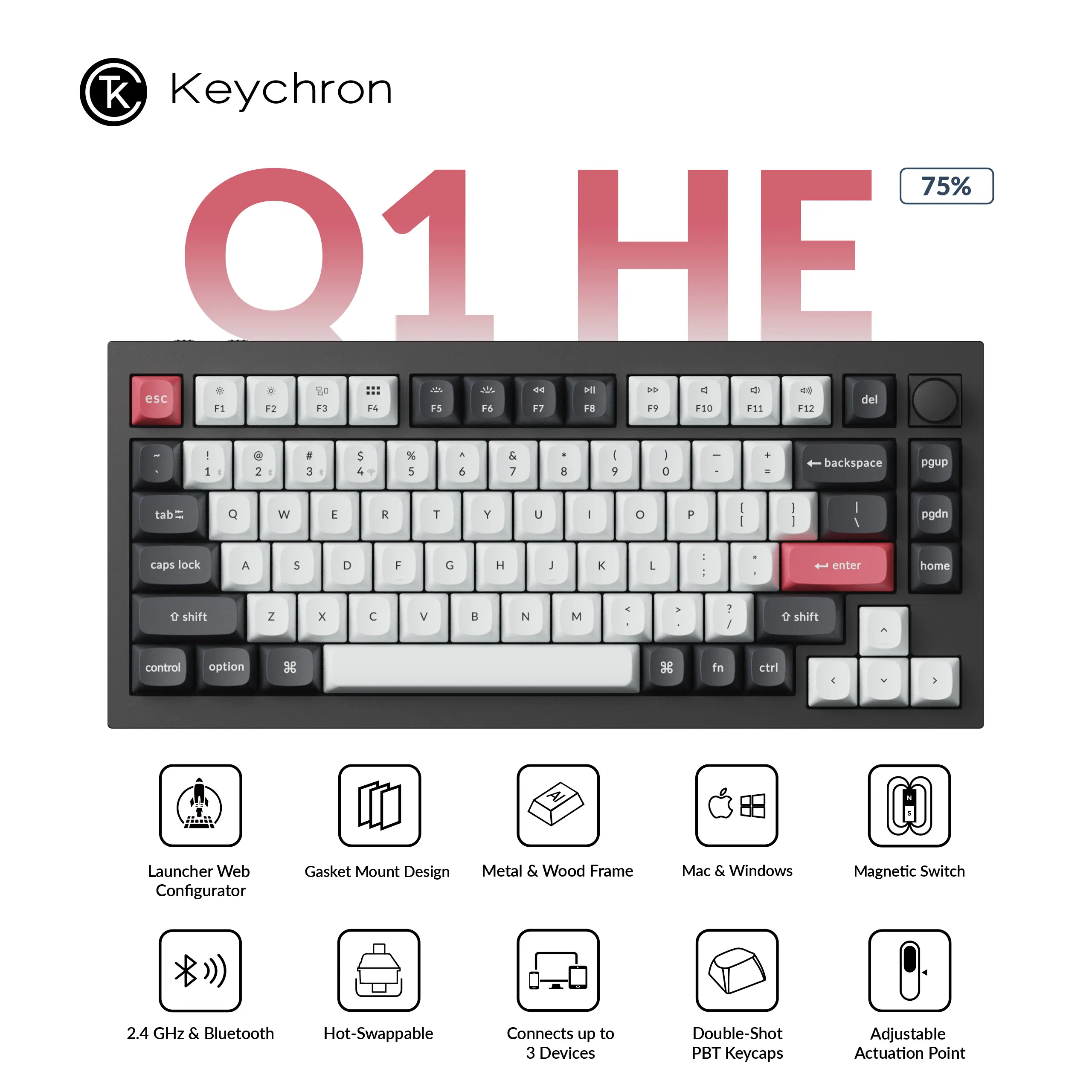 Meet the Q1 HE, the world's first 75% layout wireless QMK custom keyboard equipped with Hall Effect Gateron double-rail magnetic switches. These switches provide a distinct advantage due to their unique mechanism, offering faster feedback, dynamic rapid triggering, and adjustable actuation points, resulting in epic enhancements for the gaming experience tailored to your individual preferences.