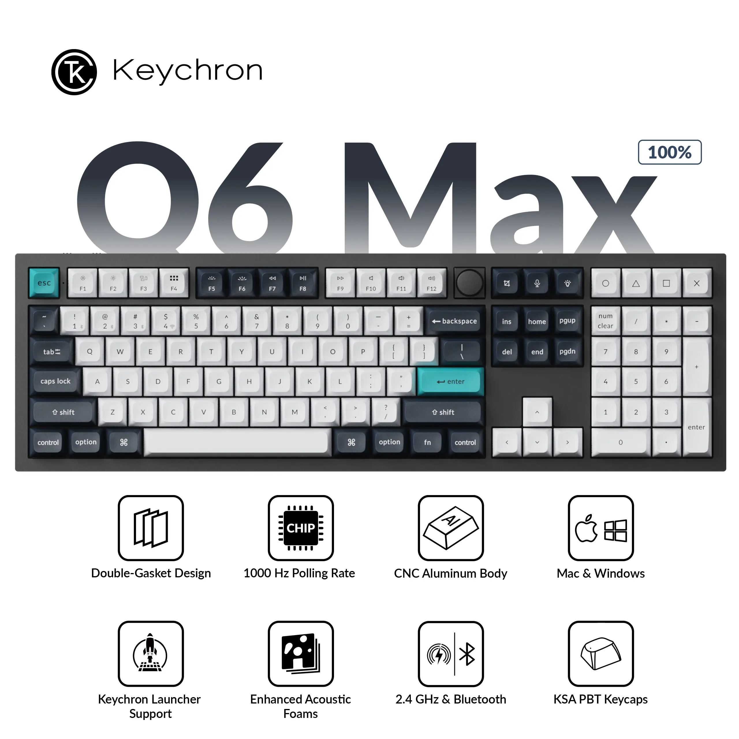 Introducing the Keychron Q6 Max, a full-metal QMK wireless customized mechanical keyboard with a 100% full-size layout and support for 2.4 GHz wireless, Bluetooth 5.1, and Type-C wired connectivity. The combination of reinforced multi-layer acoustic foam and double-gasket design provides an incredibly satisfying typing experience while ensuring a superior sound quality.