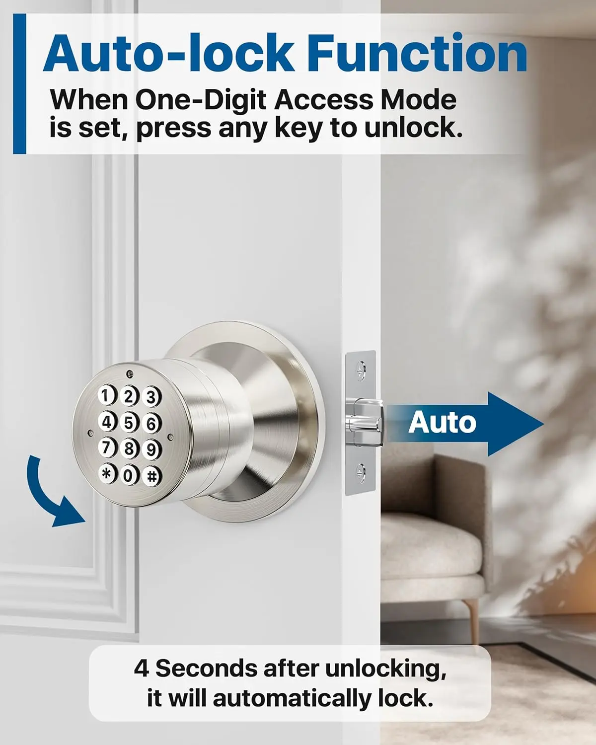 【 Lovers】Whether you're strolling down a path or going for a jog, our keypad door knob eliminates the need for bulky keychains and the worry of losing . keyless entry door lock will automatically lock within 5 seconds. Simply enter your personal user code to unlock the keyless door knob when you return .
