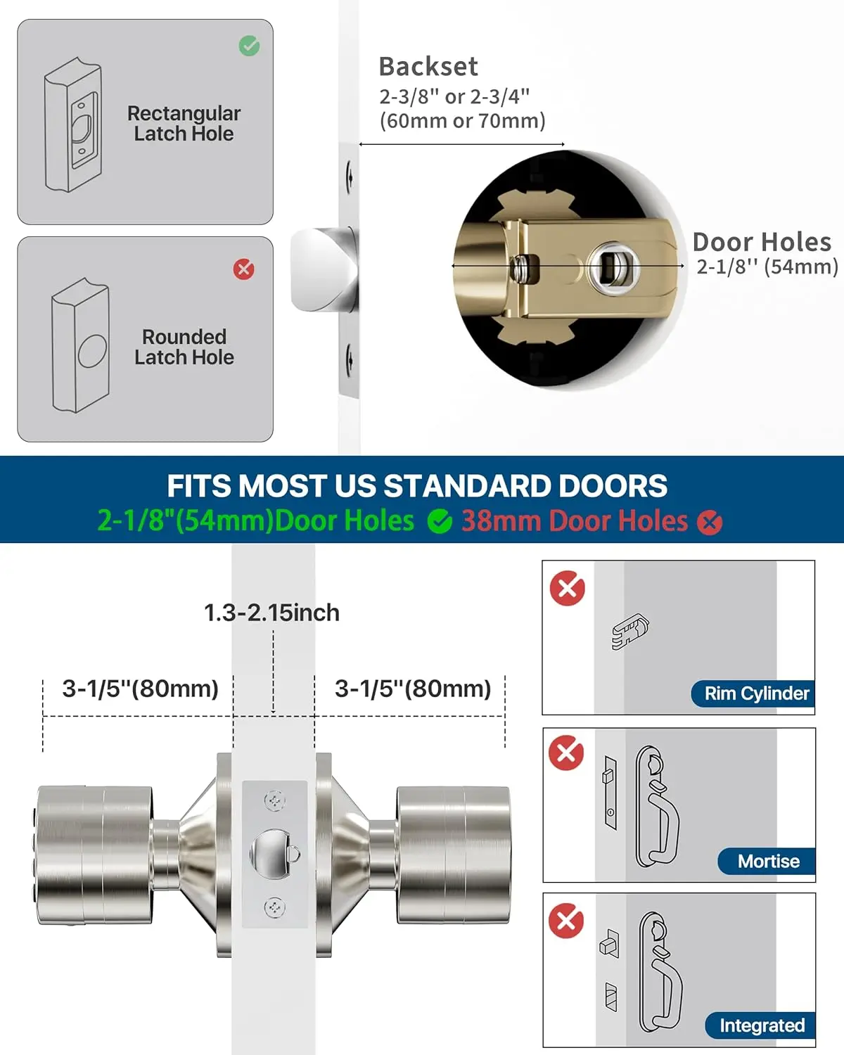 Versatile Fit: Designed to fit standard doors, its adaptable knob suits both left and right-handed doors. The latch is adjustable to fit 2-3/8-Inch (60mm)or 2-3/4-Inch (70mm) backsets with 54mm door hole in diameter.