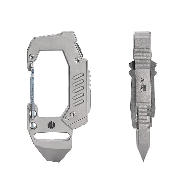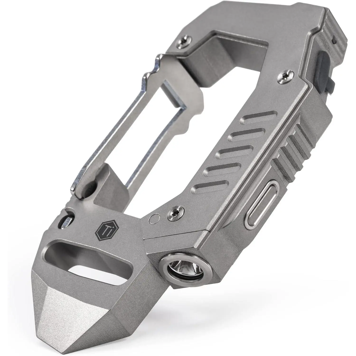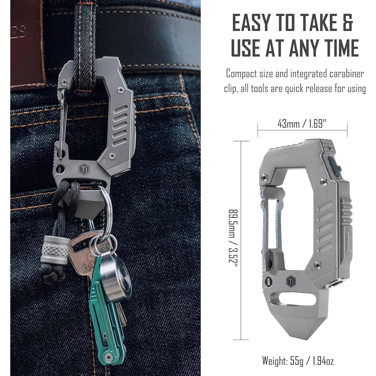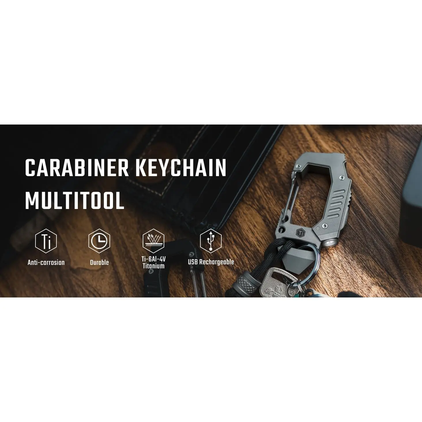 7 TOOLS IN CARABINER: This multitool carabiner can be used as a EDC keychain, LED flashlight, bottle opener, slotted screwdriver, pry, box opener, also can be used as a breaker.It’s a keychain tool that great for daily useMADE FOR EVERYDAY CARRY: Compact size of 3.52"69" x 0.75", weight only.94oz makes it the perfect keychain accessory, conveniently attach to key rings or EDC tool.Designed with a carabiner clip that can be attached to pants loop, backpack, carry bag, or camping bag for easy access, all tools are quick release for usingMICRO USB: The keychain flashlight is powered by 120mAh lithium polymer battery, with max output 360 lumens, 5 lighting modes available.It is a must-have flashlight for your EDC.The flashlight is, resistance, perfect to use as a backup light in emergency, such as reading, dog walking, repairing, etcPREMIUM QUALITY: Made of lightweight Ti-6al-4v alloy, our compact carabiner keychain features a craftsmanship with antique finish, sandblasted process, heat resistance, corrosion and scratch, it’s 4 times strength of key organizerMULTIPLE APPLICATION: This EDC carabiner is the perfect accessory as it combines and convenience, you can use it in a variety of scenarios, which it a necessary for camping, backpacking, hiking and outdoors activities