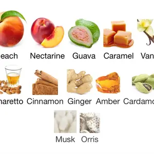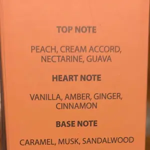 🔥 Floral Fruity Gourmand creamy finest 🥰 top notes include peach, nectarine, and guava. The middle notes are vanilla, amber, cinnamon, and ginger. The base notes feature caramel, sandalwood, and musk.
