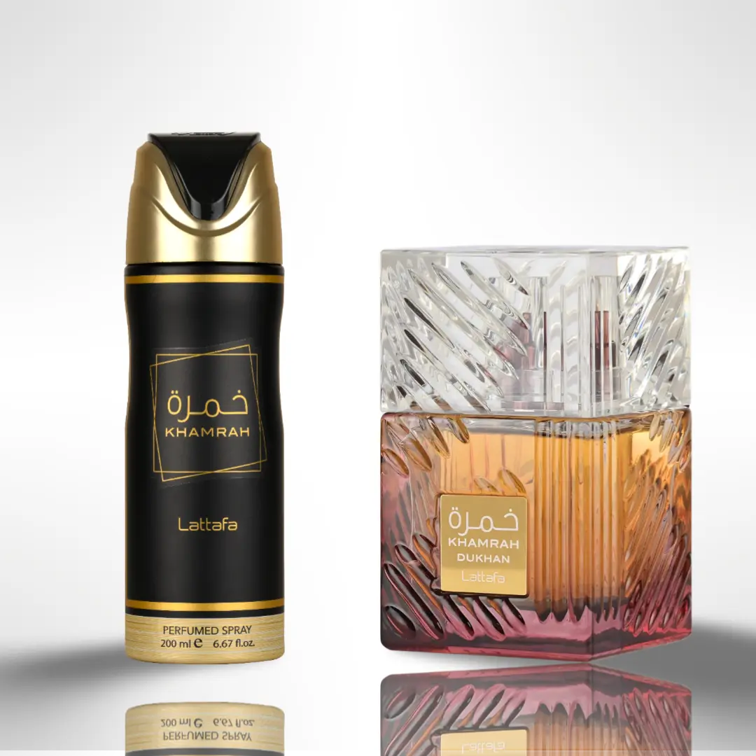 Immerse yourself in the captivating depth of Lattafa's finest with this luxurious fragrance gift bundle. Combining the smoky seduction of Khamrah Dukhan Eau de Parfum with the fresh intensity of the Khamrah Deodorant Spray,