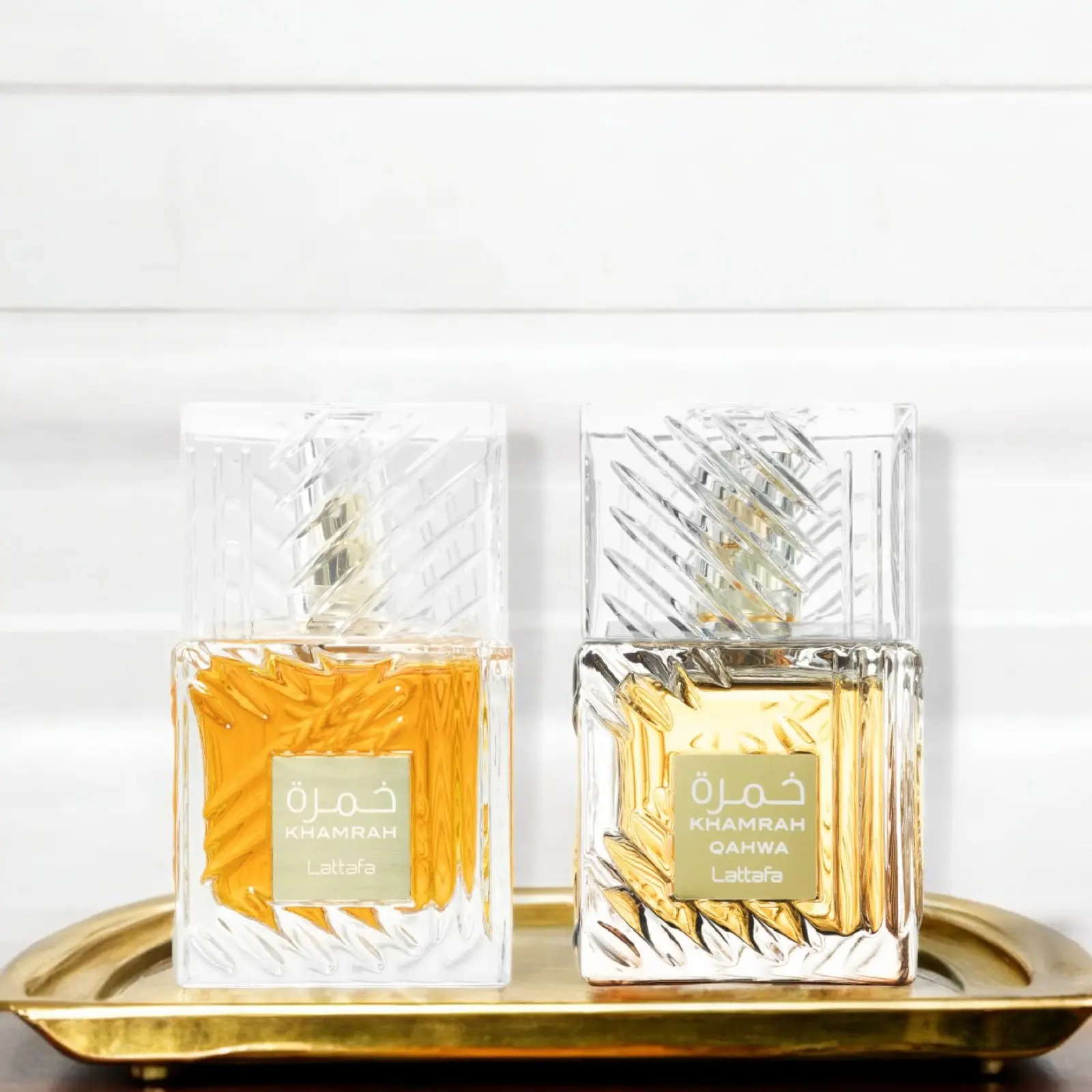 Indulge in the luxurious and captivating scents of Lattafa Perfumes' Khamrah & Khamrah Qahwa, a unisex fragrance set that comes with two 100ml bottles.