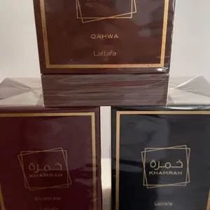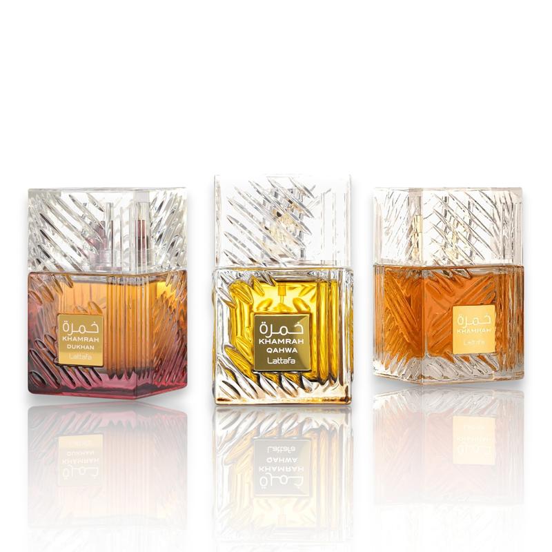 Experience the luxurious aroma of Lattafa Perfumes with this exquisite 3-Piece Fragrance Set. This set includes three captivating scents: Khamrah, Khamrah Qahwa, and Khamrah Dukhan, each crafted with care to enhance your fragrance collection.