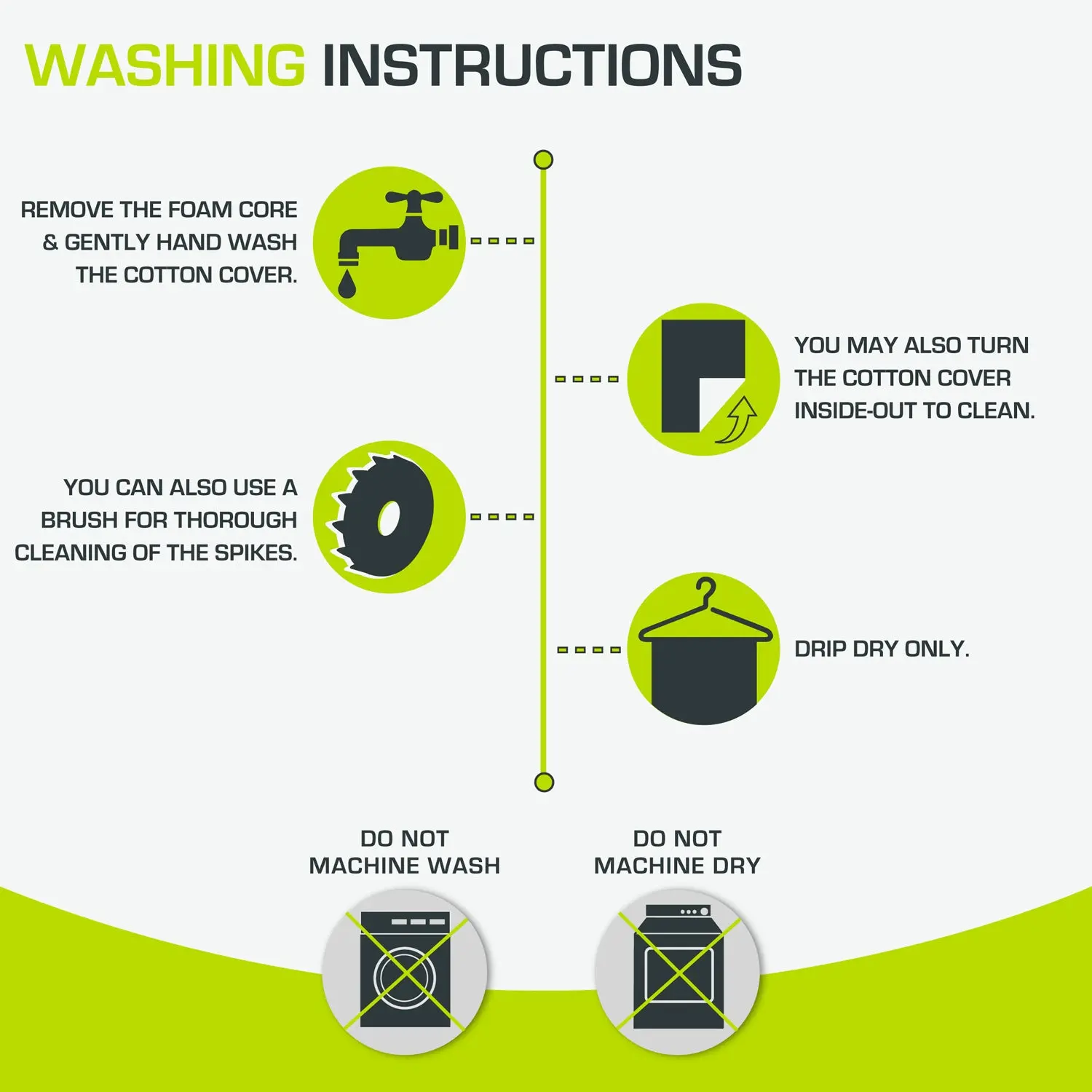 Care: Store your Acupressure Mat and Pillow in a cool, dry place. To clean, turn the linen cover inside-out before hand-washing. Do not machine wash or dry, as this may damage the pressure point buttons. Drip dry only.