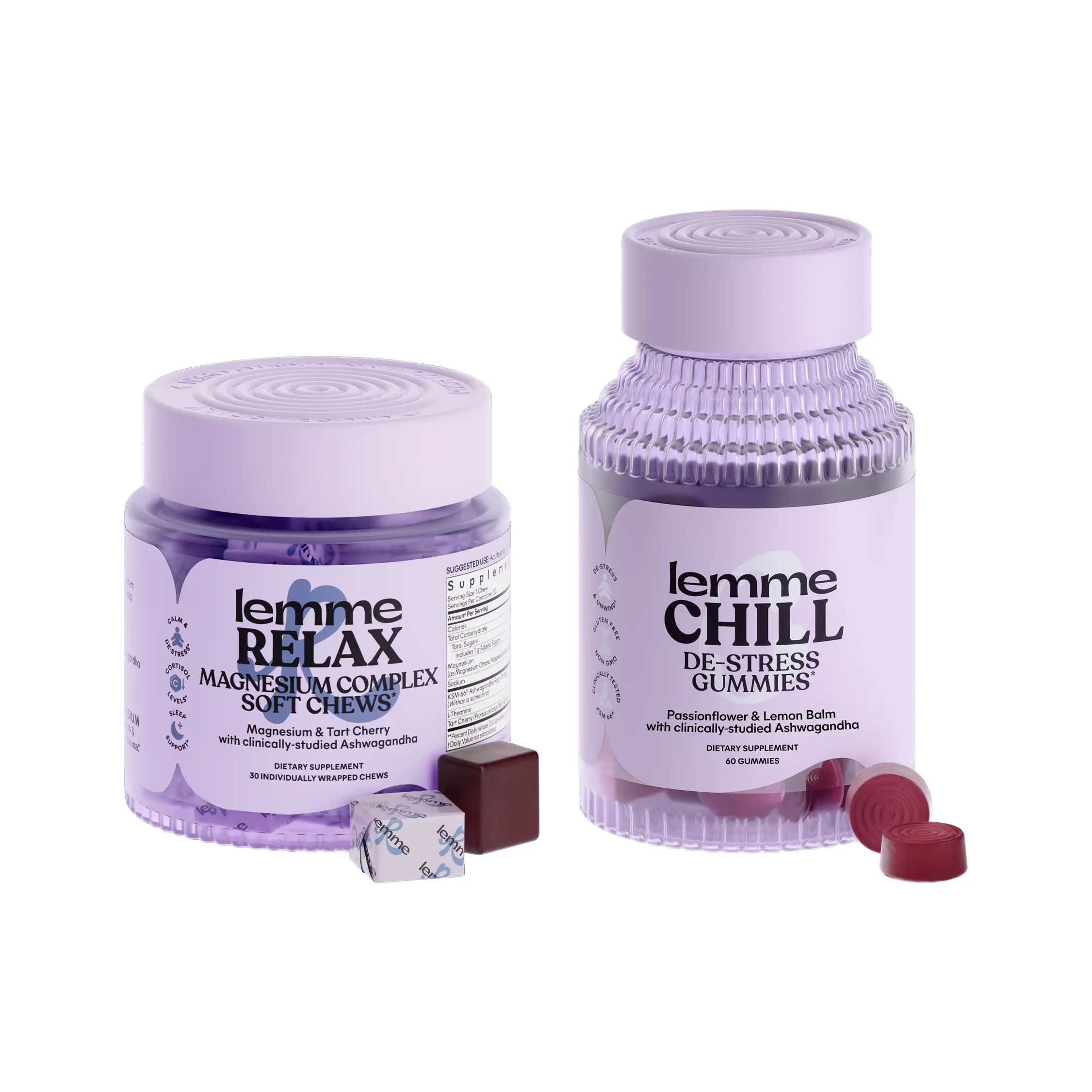 KSM-66 Ashwagandha Root Extract, Lemon Balm Extract, Passionflower Extract, Goji Berry Extract, Organic Tapioca Syrup, Organic Cane Sugar, Water, Citric Acid, Coconut Oil, Carnauba Wax, Fruit and Vegetable Juice (for color), Natural Flavor, Pectin, Sodium Citrate,KSM-66 Ashwagandha, multi-source Magnesium, L-Theanine, and Tart Cherry. Other ingredients: Tapioca Syrup, Organic Raw Cane Sugar, Non-GMO Palm Oil, Natural Flavor, Citric Acid, Fruit and Vegetable Juice (for color), Sunflower Lecithin, Sea Salt, Stevia (Reb M), and Monk Fruit