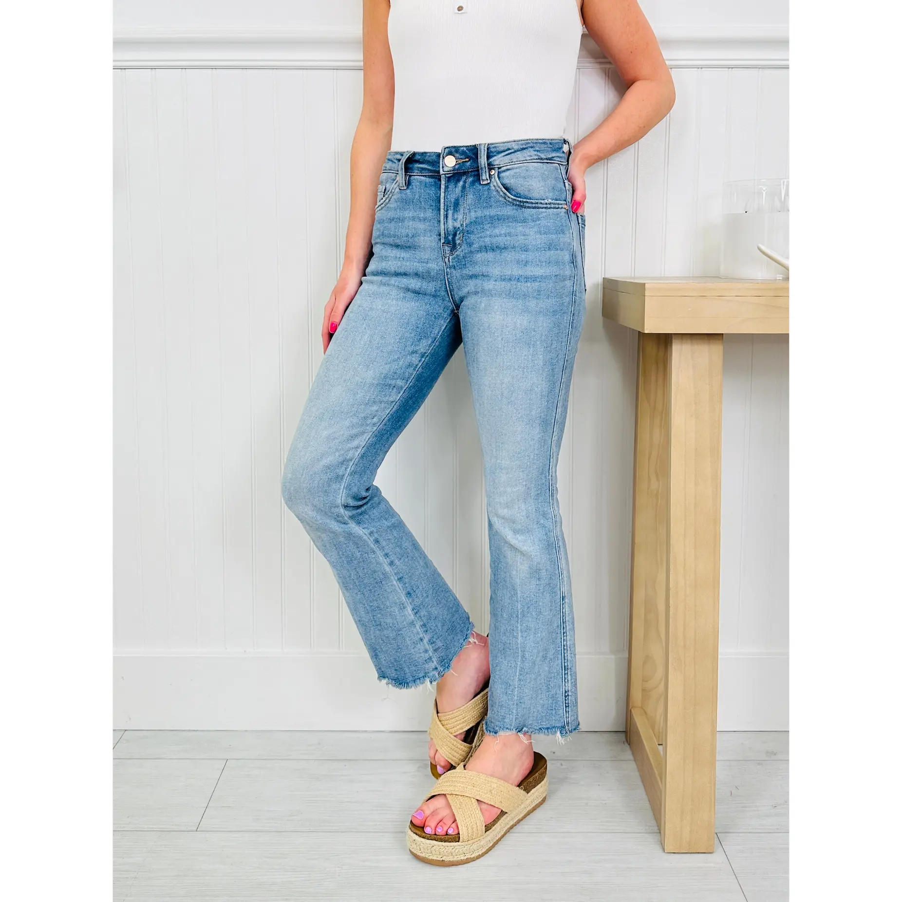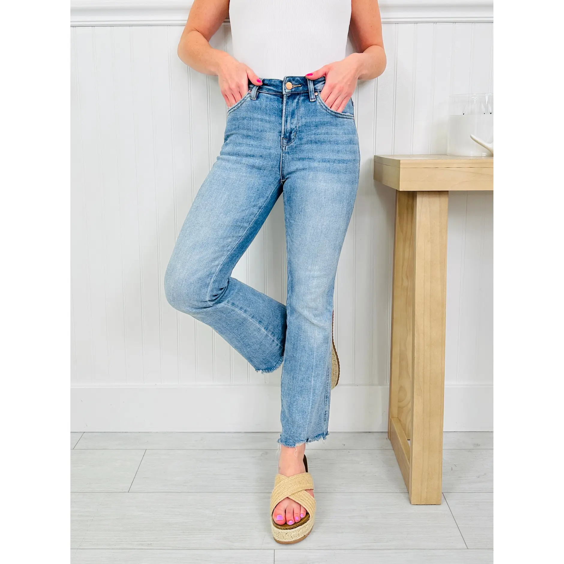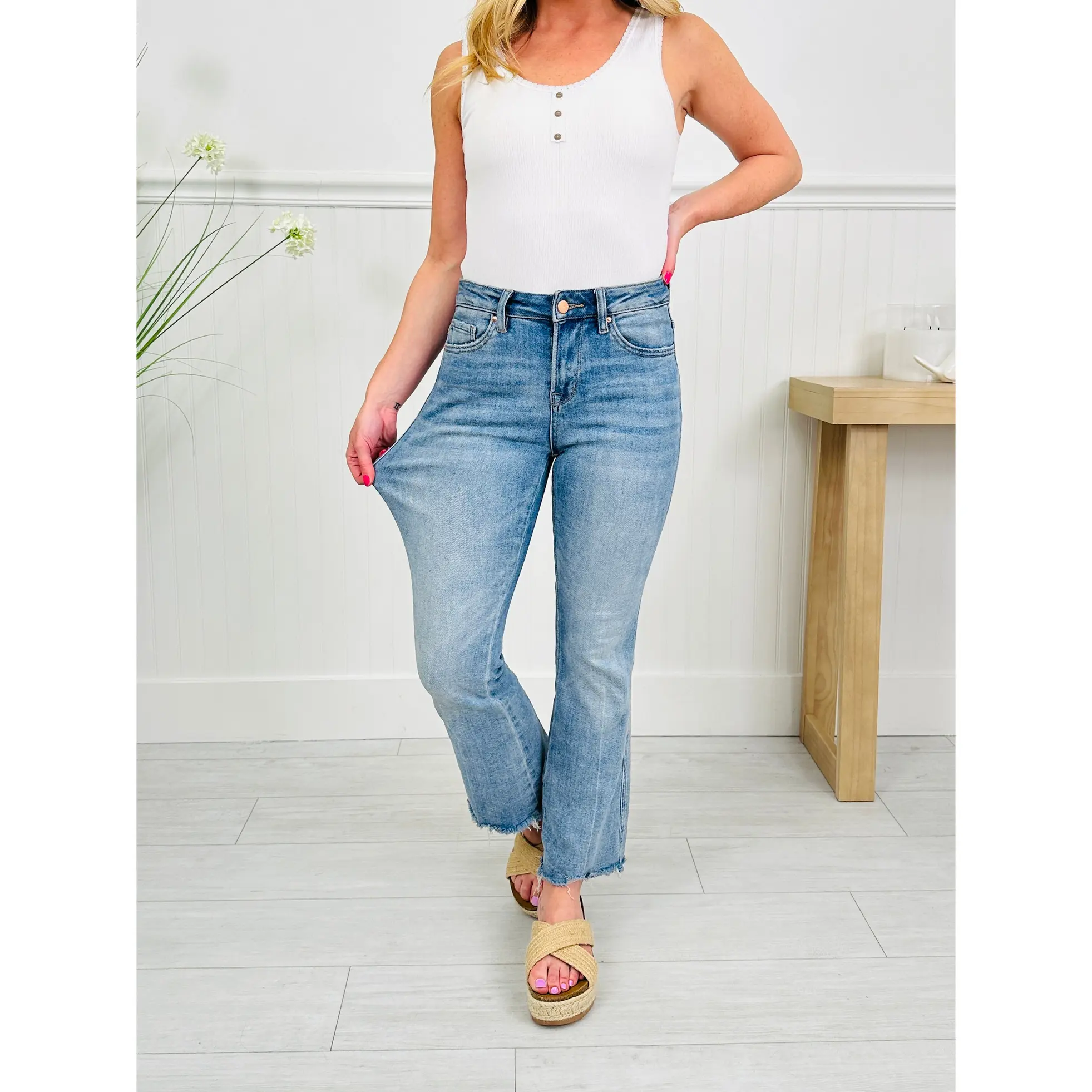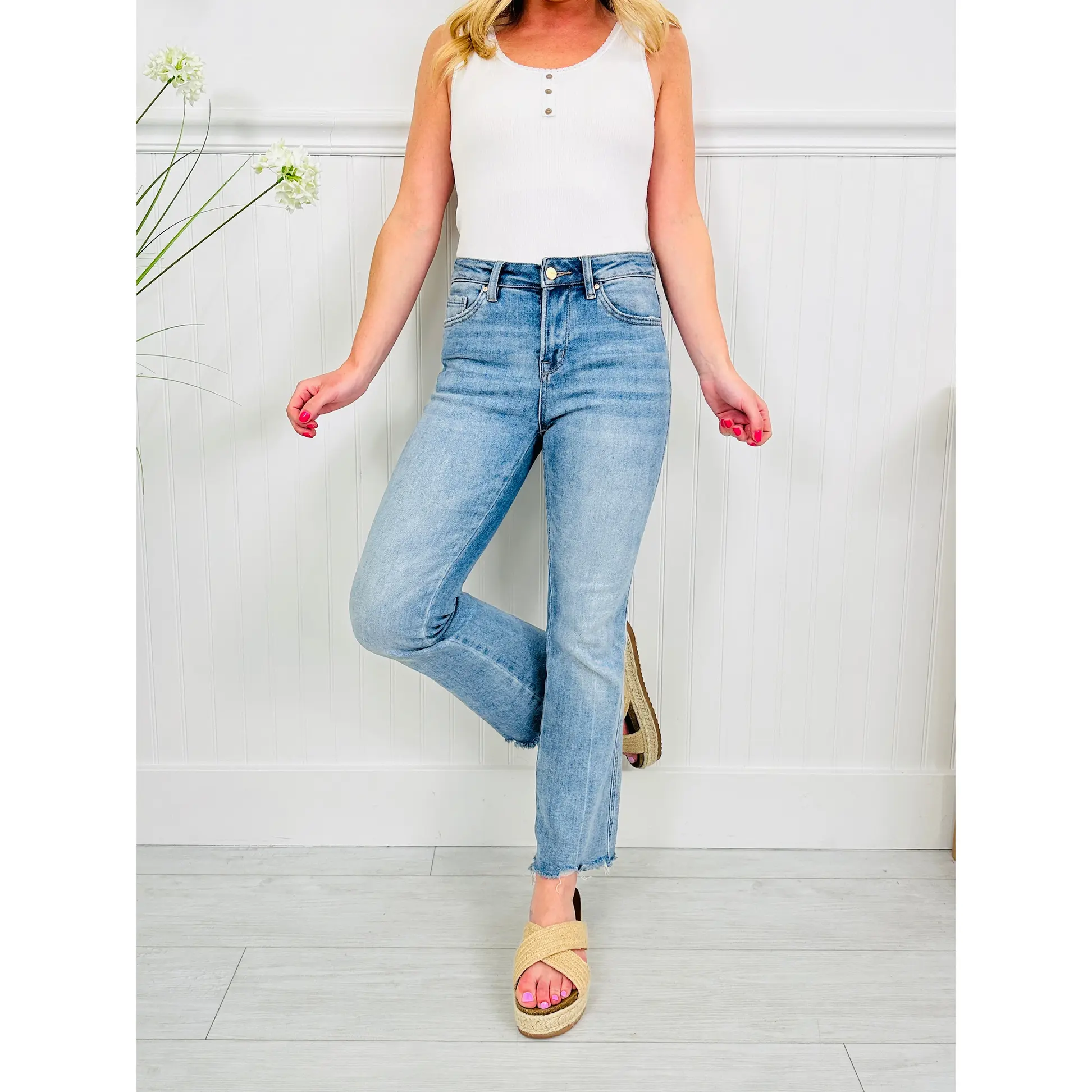 The wash is spring perfection and the trendy raw hem gives these non distressed jeans a pop of detail that your spring wardrobe needs. Dress these up with wedges and a spring sweater or tank or down with your favorite graphic tee and sneakers or flip flops. These non distressed jeans are versatile and you'll reach for them again and again this season. These jeans never last long when they restock, so grab them while you still can!