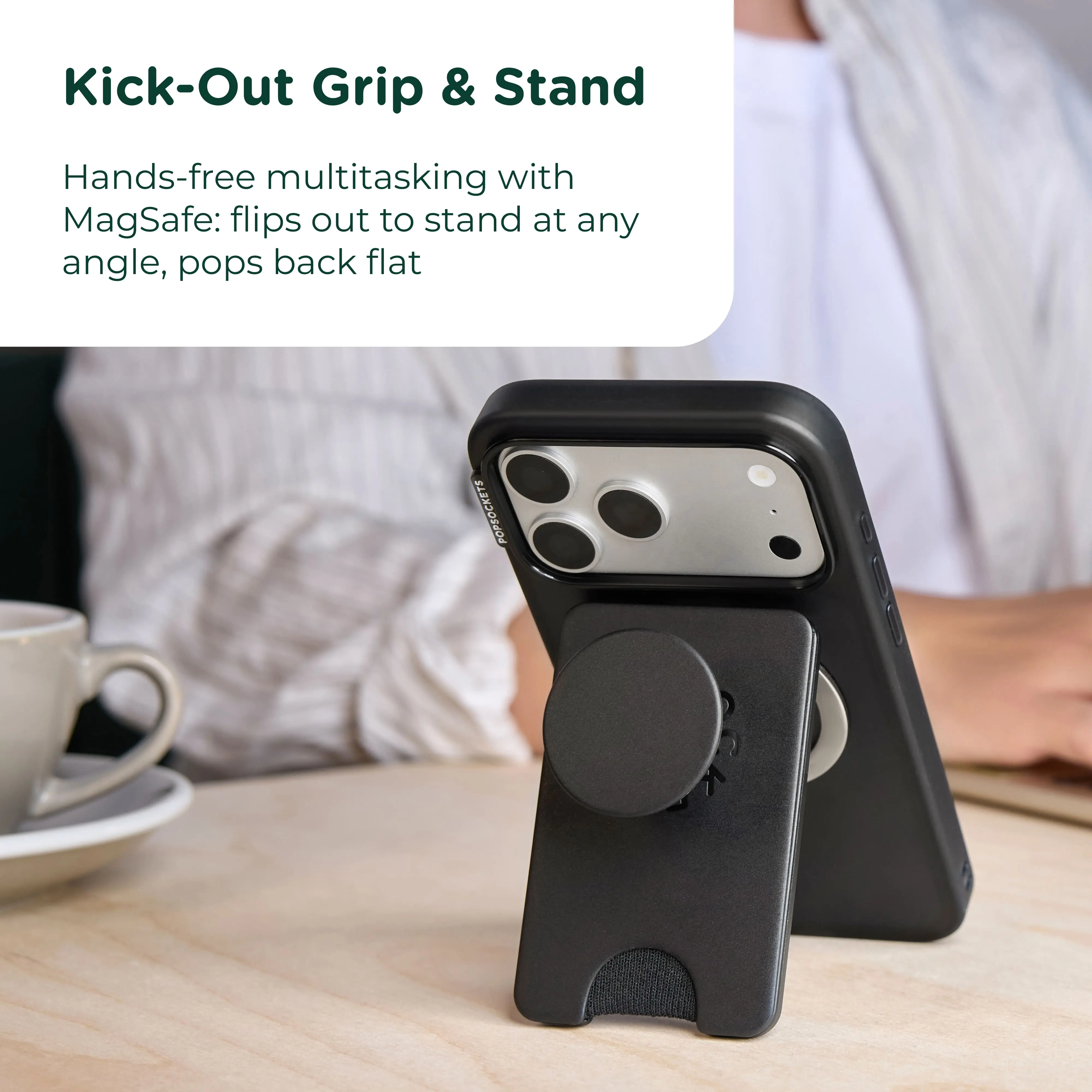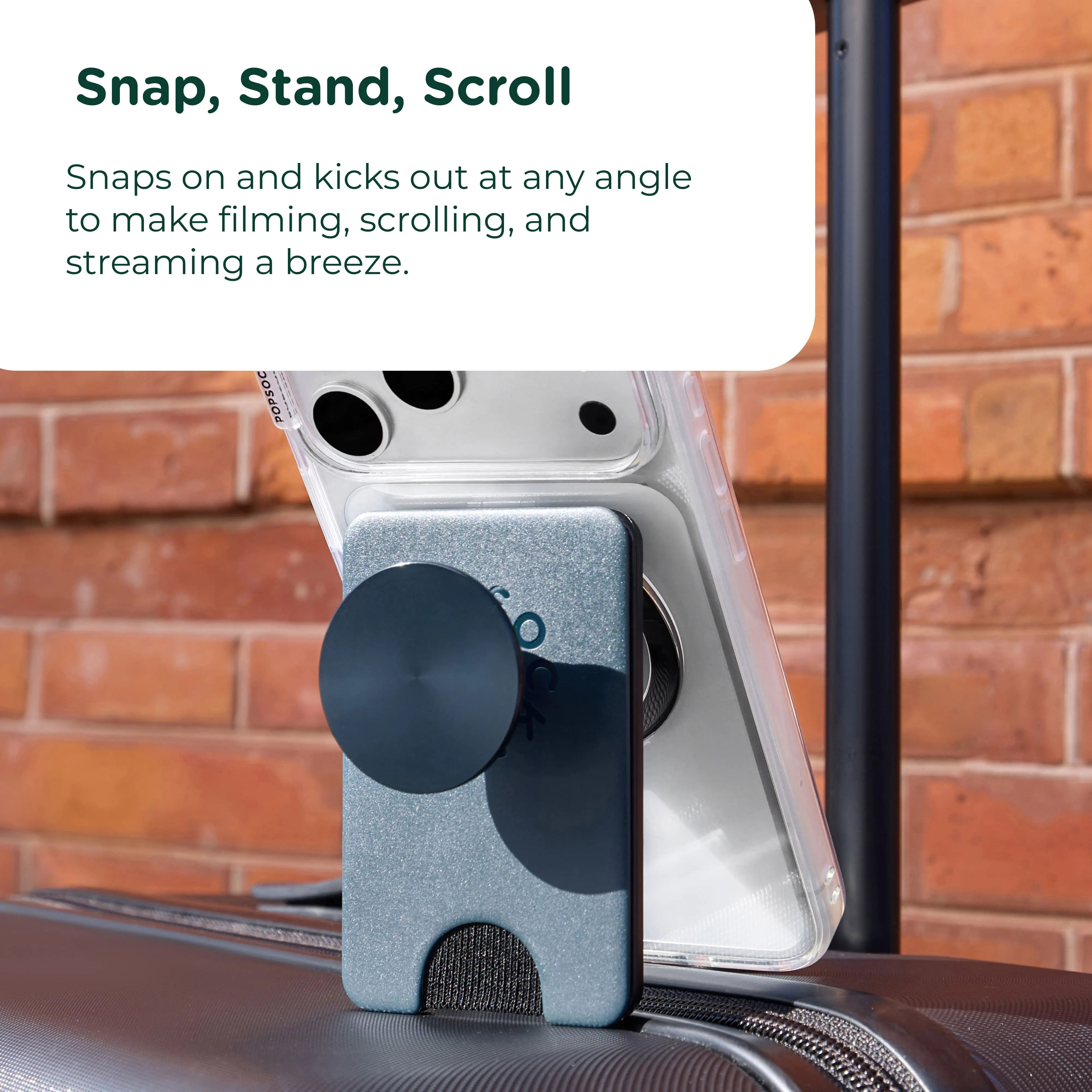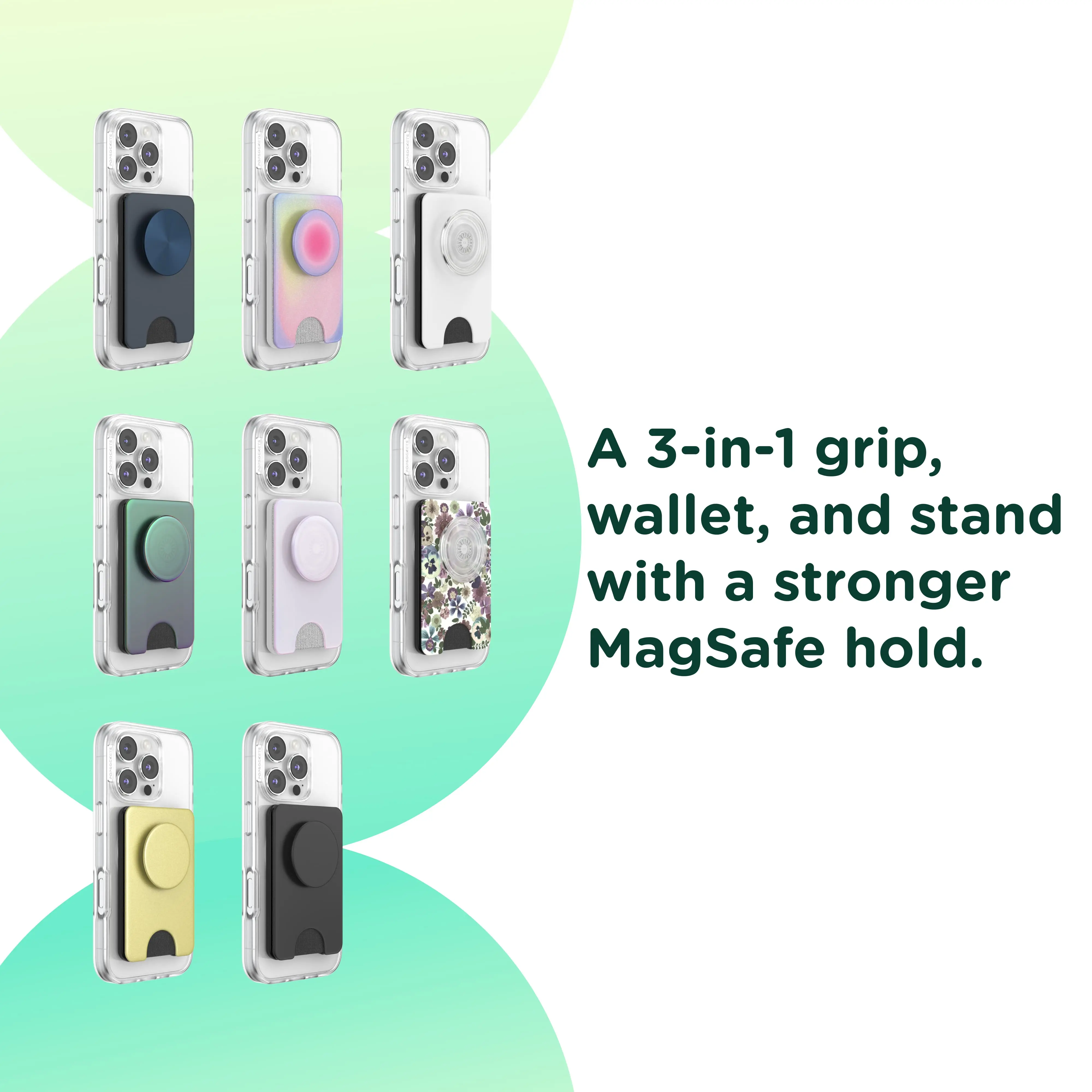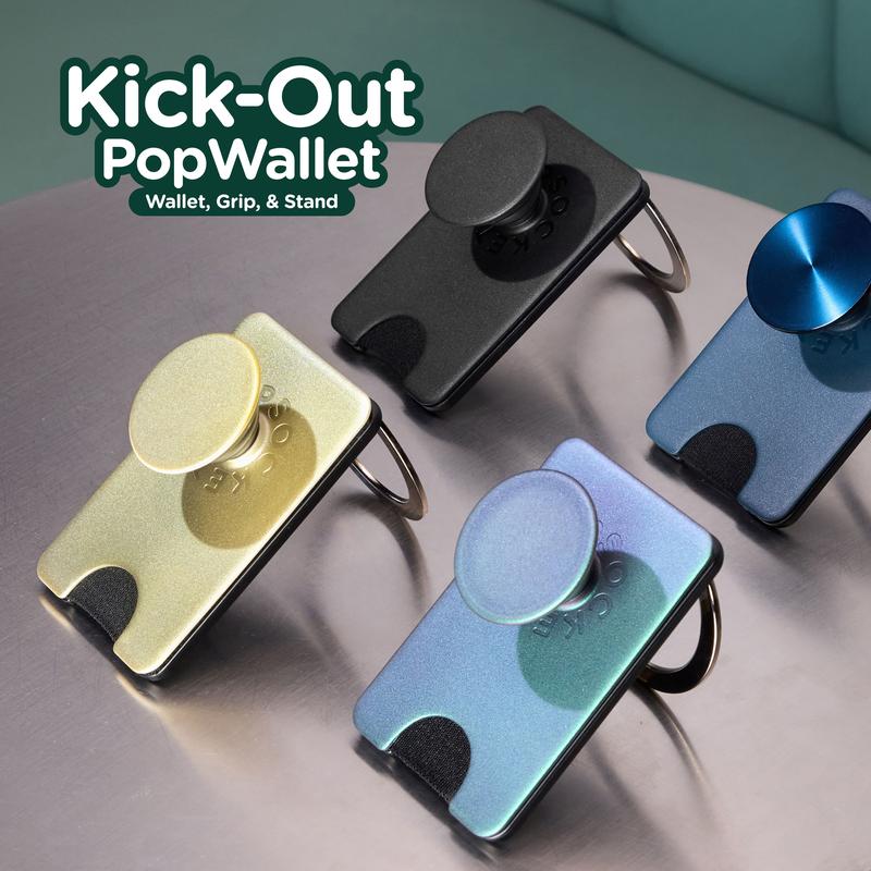 Simply snap on and off for a wallet, grip, and stand in one