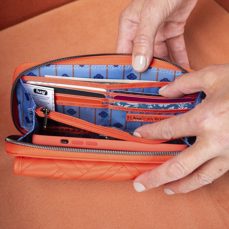 Interior Features: Seven card slots One clearview ID slot One pen holder One front zipper pocket One main zipper compartment Two belt loops to wear as belt bag Adjustable and removable crossbody strap RFID: The whole wallet is protected