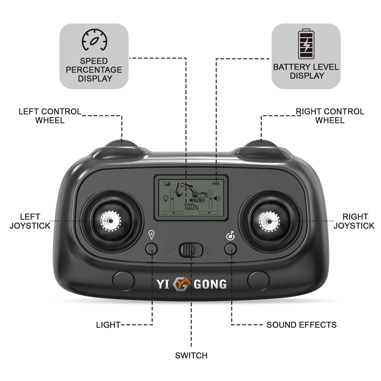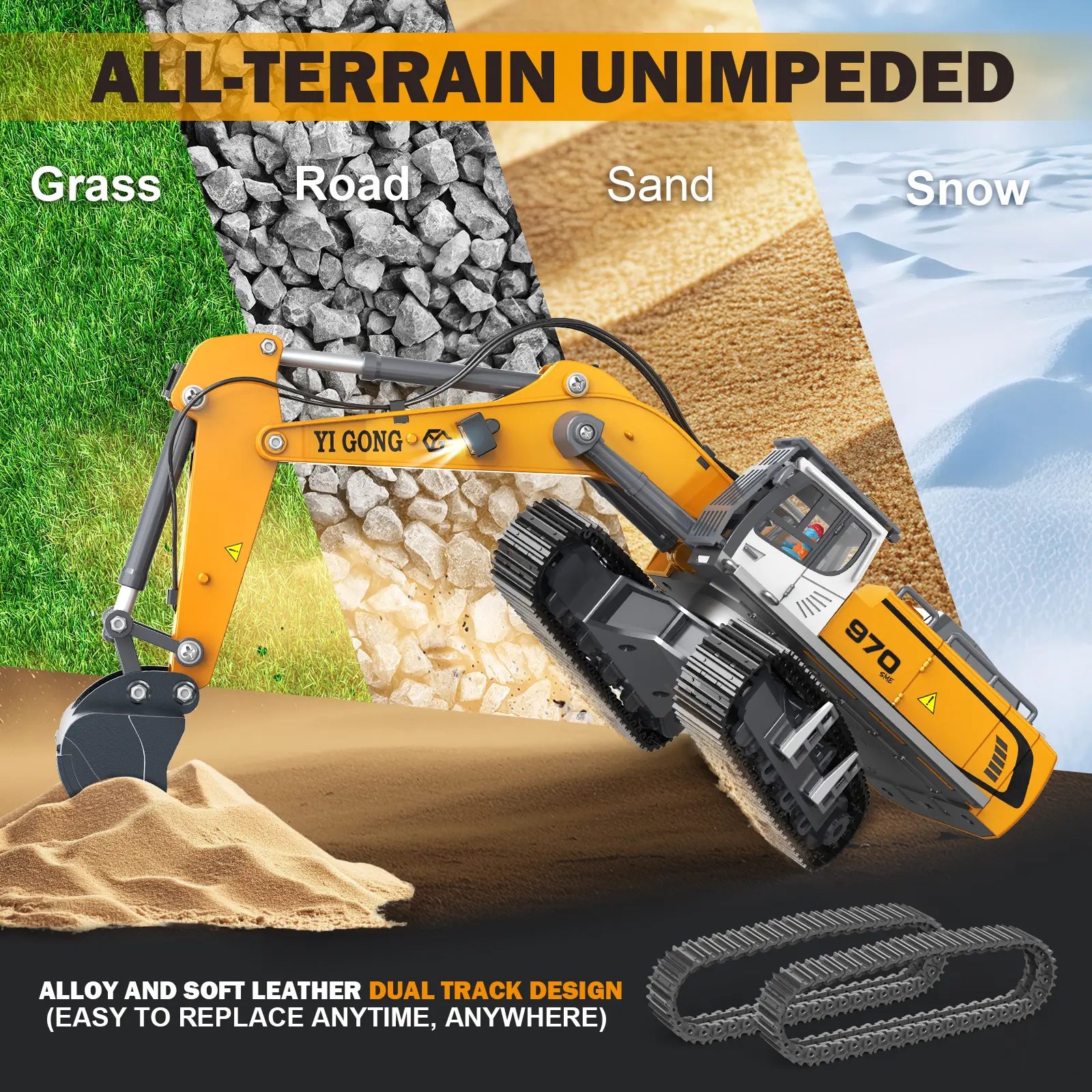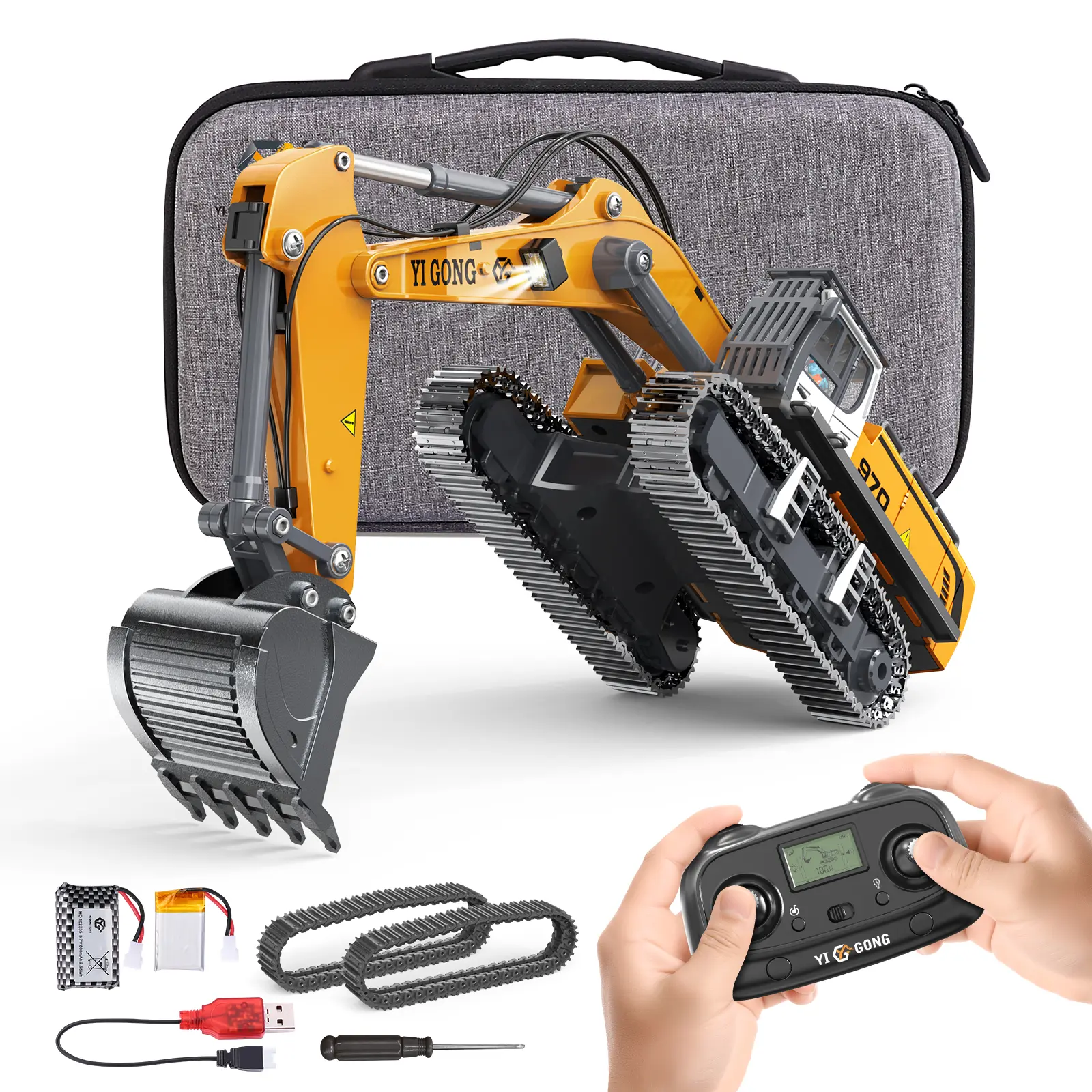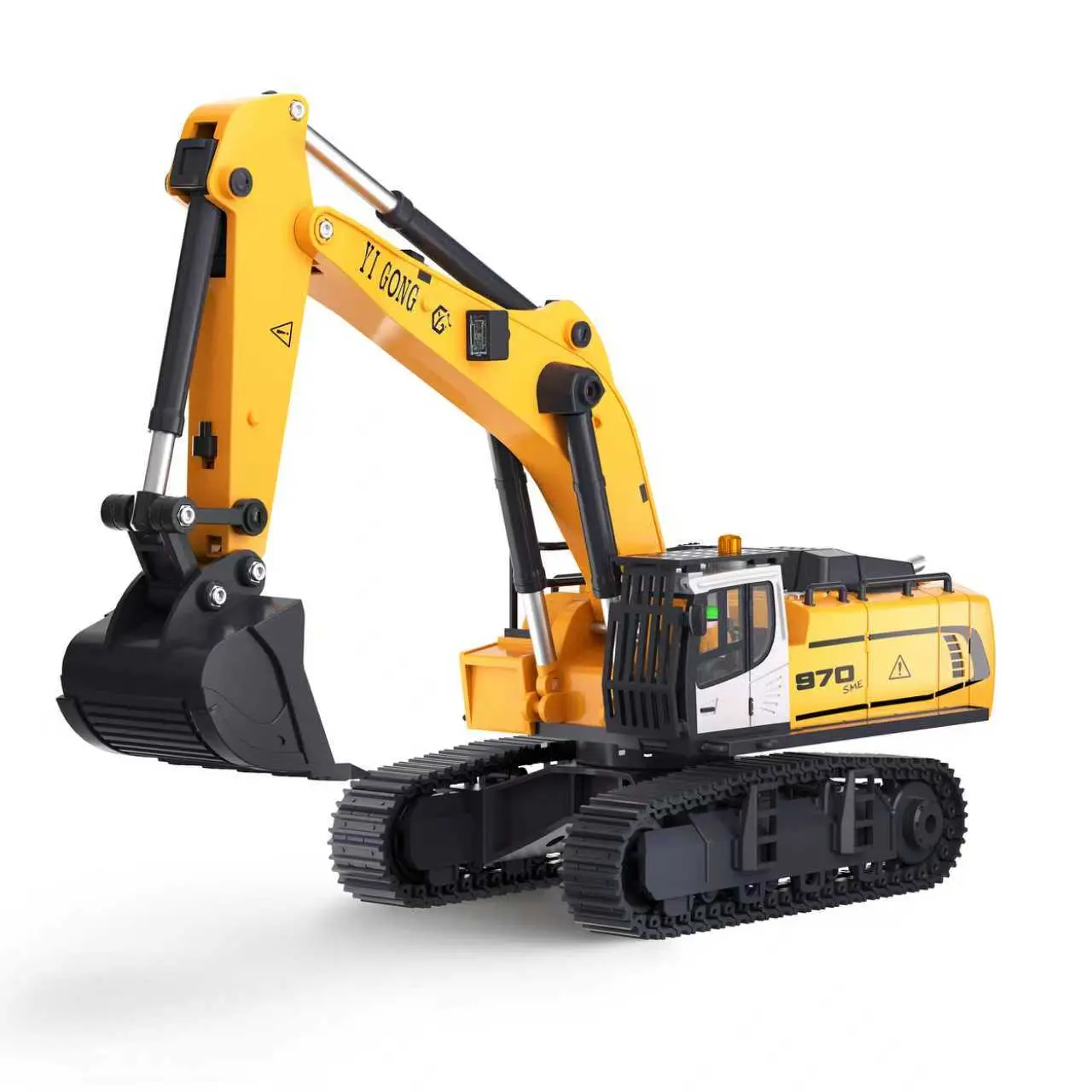 The main components, including the arm, bucket, and tracks, 90% of the materials are alloys. Additionally, lightweight components are made of ABS material to achieve the best weight balance and durability. This remote control vehicle has a sturdy structure, is collision-resistant, and can handle harsh working conditions.