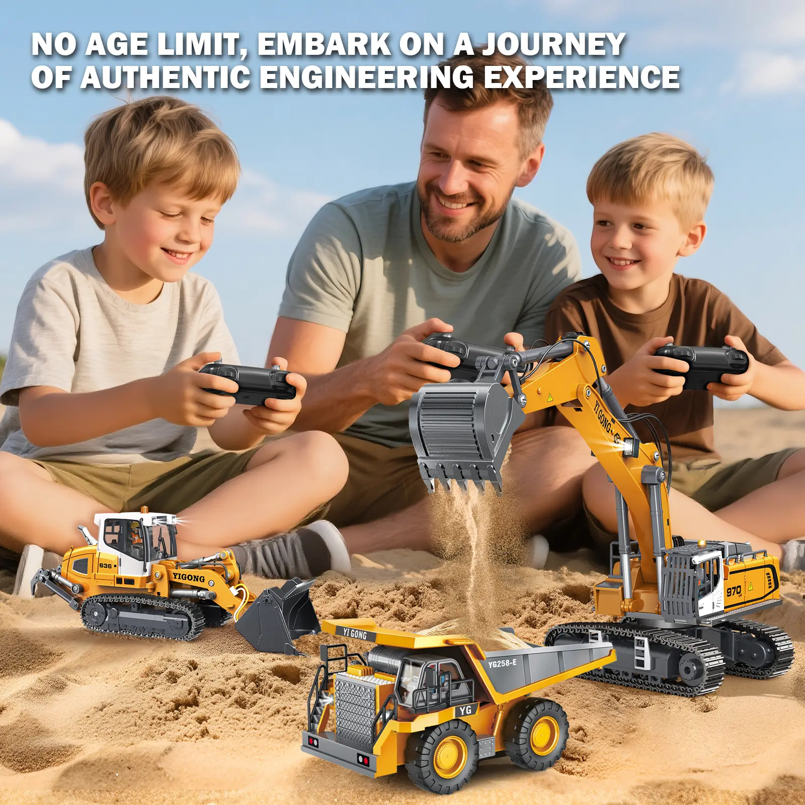 The industry's first 1:50 scale model! Precisely replicates the real object! Ultra-precise design, accurately reproduces movements, allowing you to re-create the professional construction site! Front and rear movement as well as the large digging arm can be independently controlled for elevation, providing an incredibly responsive control.