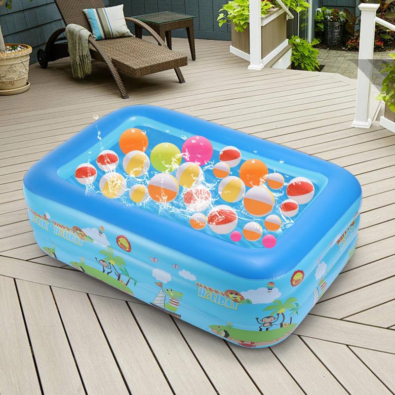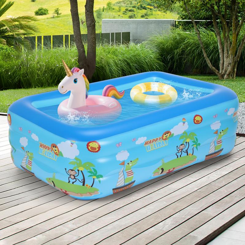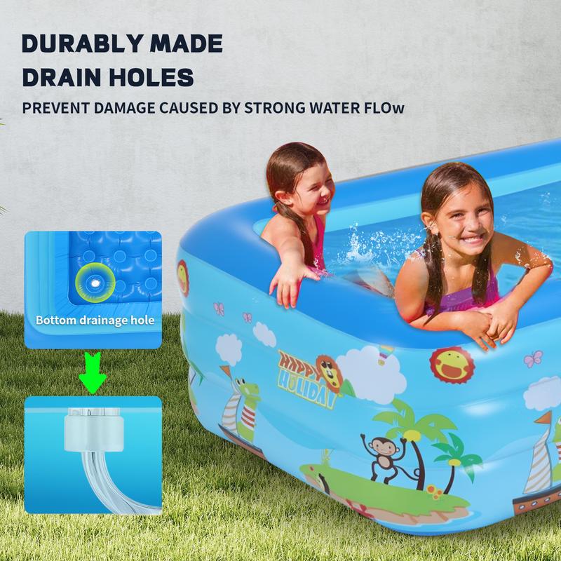 Have a great time this summer with your entire family. This inflatable children's pool is about 60 inches by 45 inches by 20 inches, offering ample room for 2 adults and 2 to 3 kids or 4 to 5 children. It's spacious and deep enough for backyard pool gatherings and ideal for refreshing yourself with loved ones throughout the summer.
