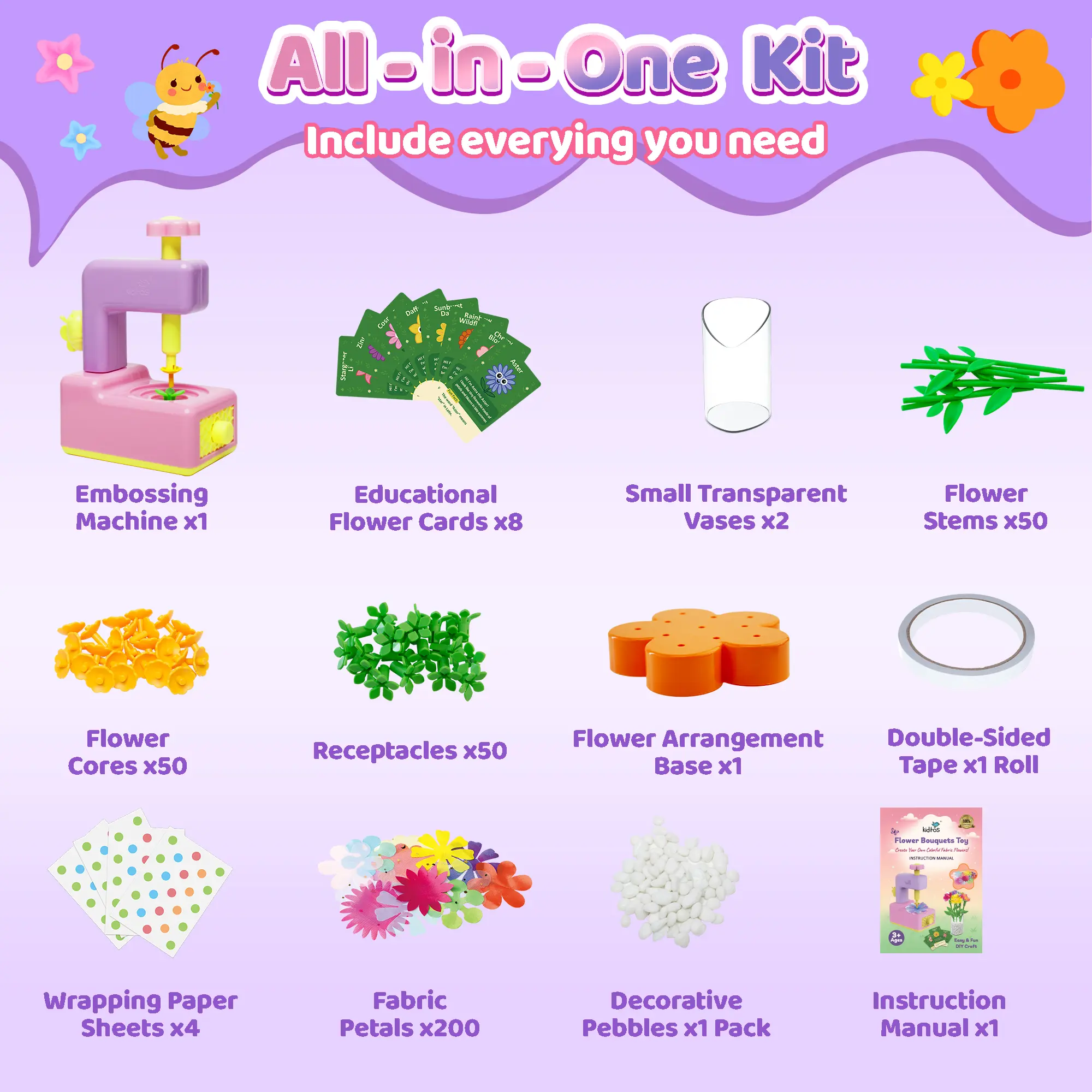 ·Rich Accessories: Our flower maker for kids includes a extra free set:Comes with 200 fabric petals, 50 flower stems, 50 receptacles, 50 flower cores, 8 educational flower cards, 2 small transparent vases, 1 flower arrangement base, 4 bouquet wrapping paper sheets, 1 pack of decorative pebbles, and 1 roll of double-sided tape. Compared with other flower making kit, our upgraded accessory set allows children to create more flowers without additional purchases.
