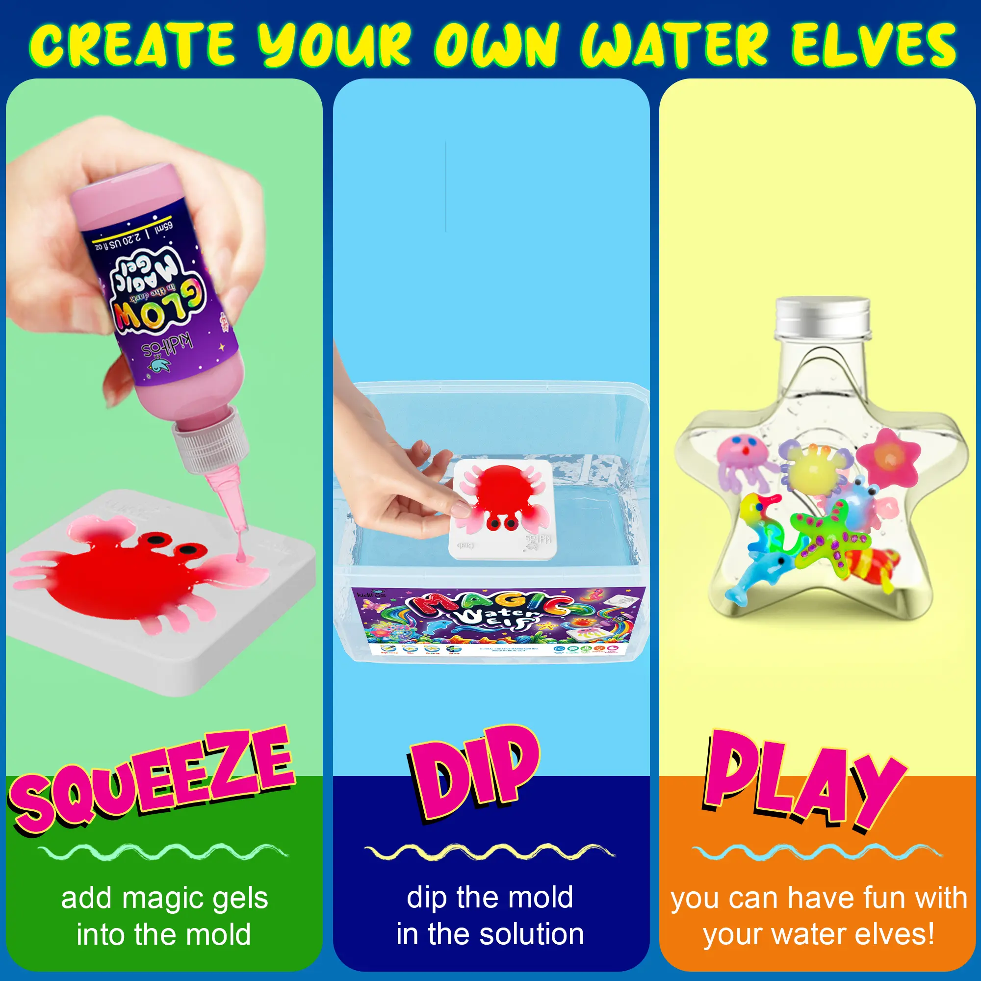 ·Educational and Fun:Designed with bright, eye-catching colors, the Magic Water Elf Kit is excellent for toddlers learning about colors. The variety of animal molds enhances cognitive skills through shape and color recognition.