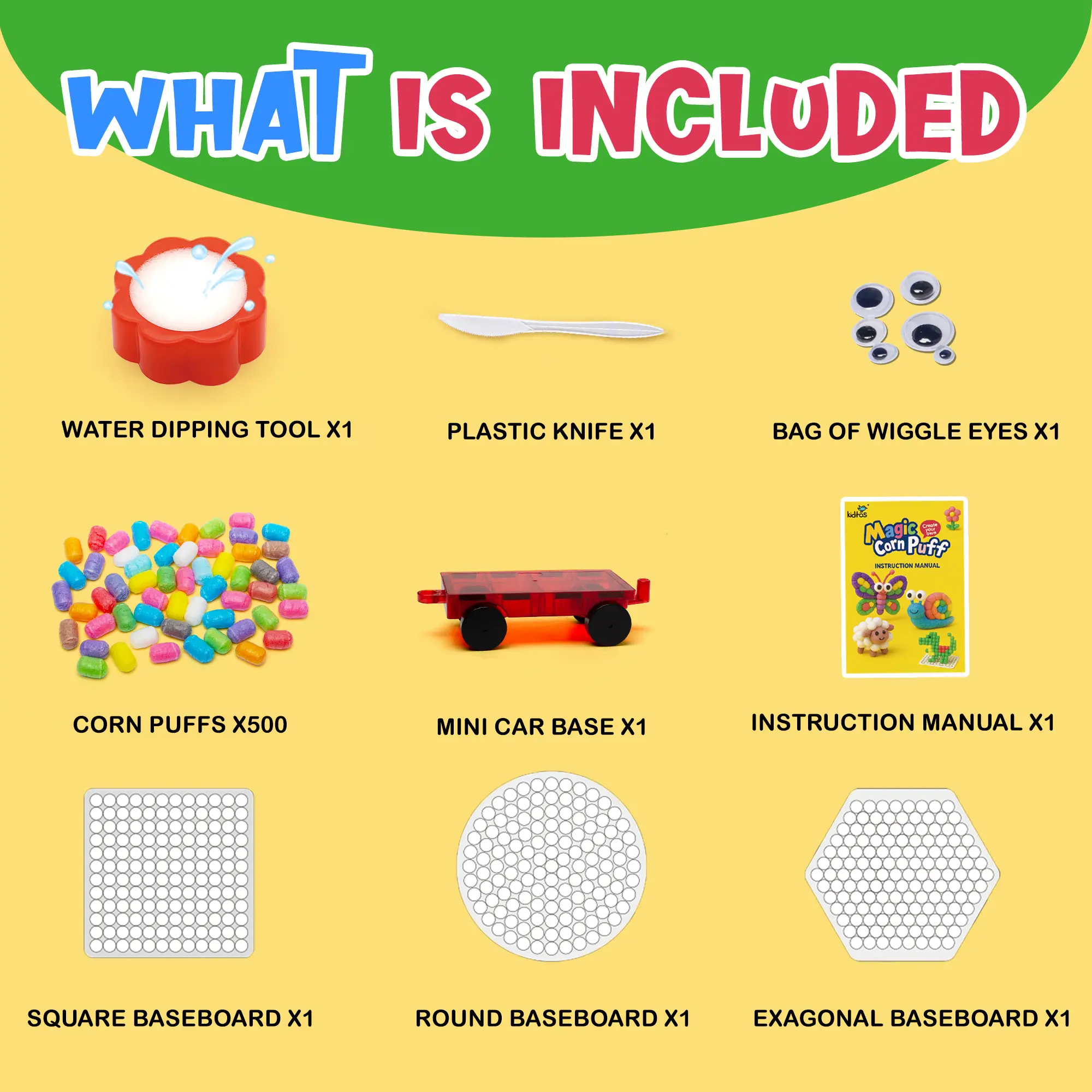·ALL-IN-ONE CRAFT SET:Kit includes sticky corn puffs, water dipping tool, mini car base, wiggle eyes, design templates, plastic knife and a guide book for easy inspiration and step-by-step building fun.