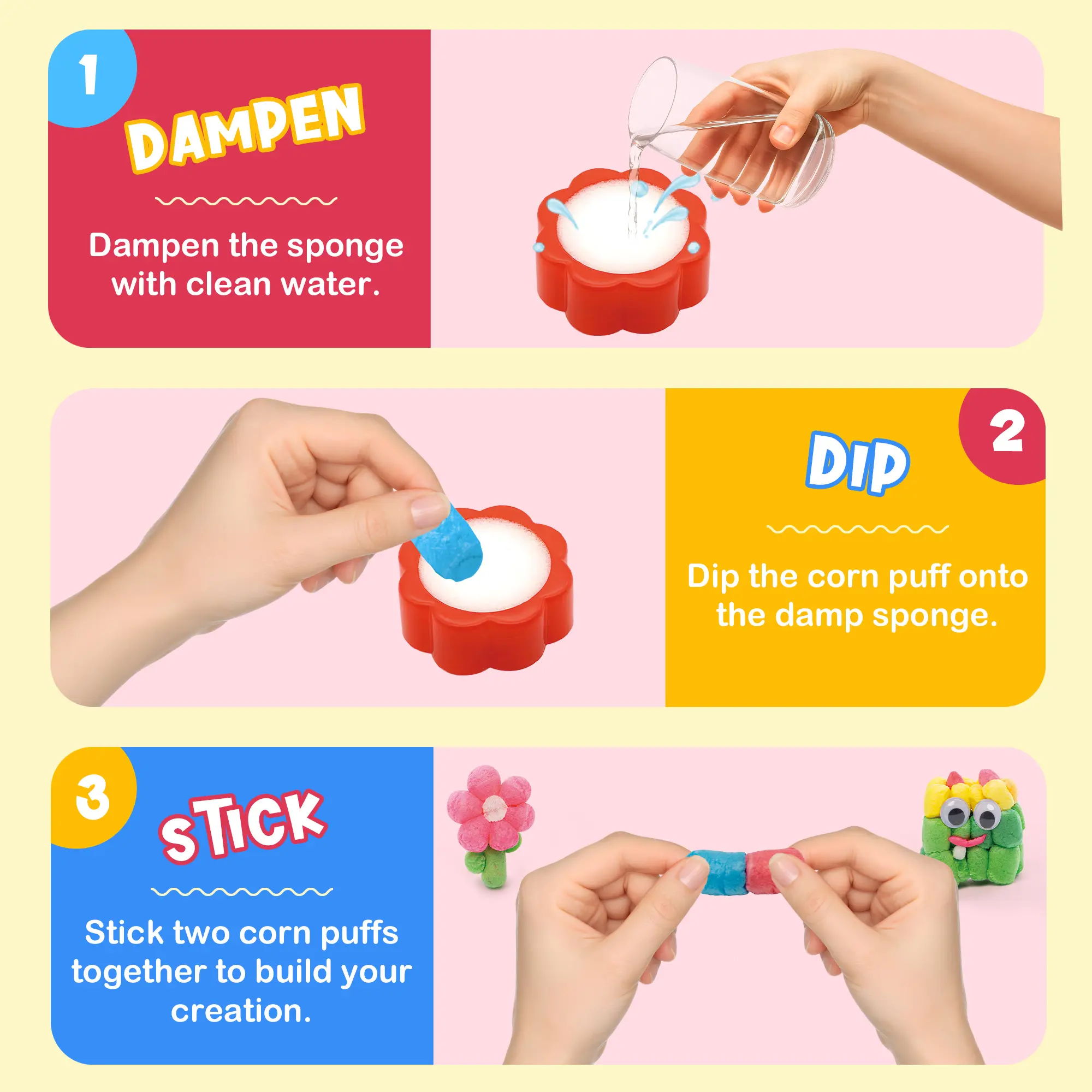 ·CREATE & IMAGINE IN 3D:Includes over 500 colorful magic corn puffs that easily stick together with just water — kids can build castles, helicopters, animals, flowers, and anything they imagine!