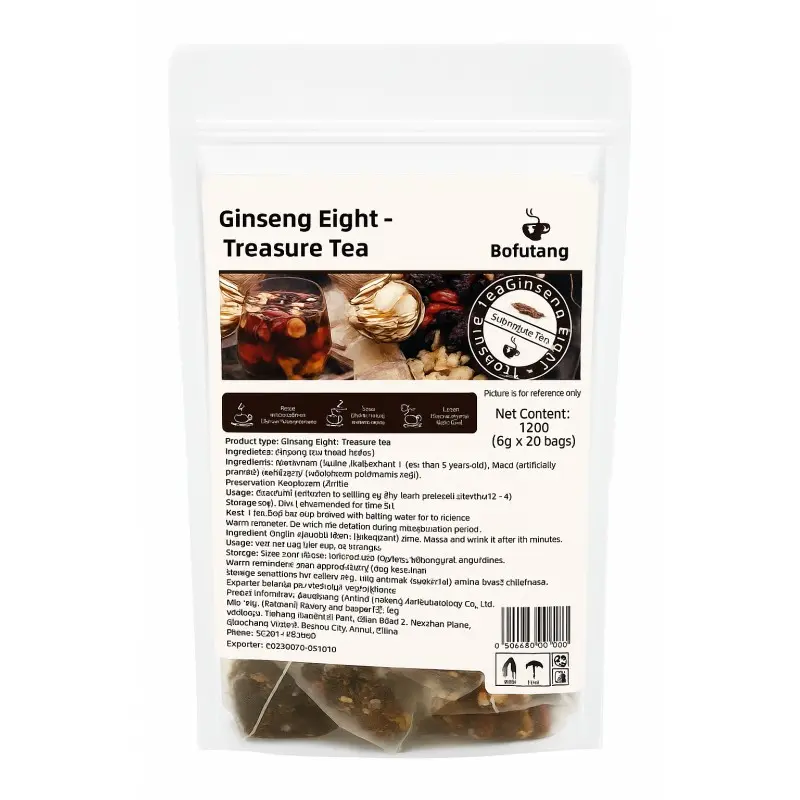 ·Taste & Texture: Babao tea Ginseng Eight Treasures Tea Kidney Tea has a strong taste and a sweet taste in the mouth. If you taste it carefully, you will have the aroma of Jujube, Mulberries and Ginseng. The color of Babao tea soup is deep and full of essence ingredients. Ginseng Tea is of good quality. Kidney tea organic cares more about men and understands men better. When you are tired, have a cup of Eight Treasures Tea.