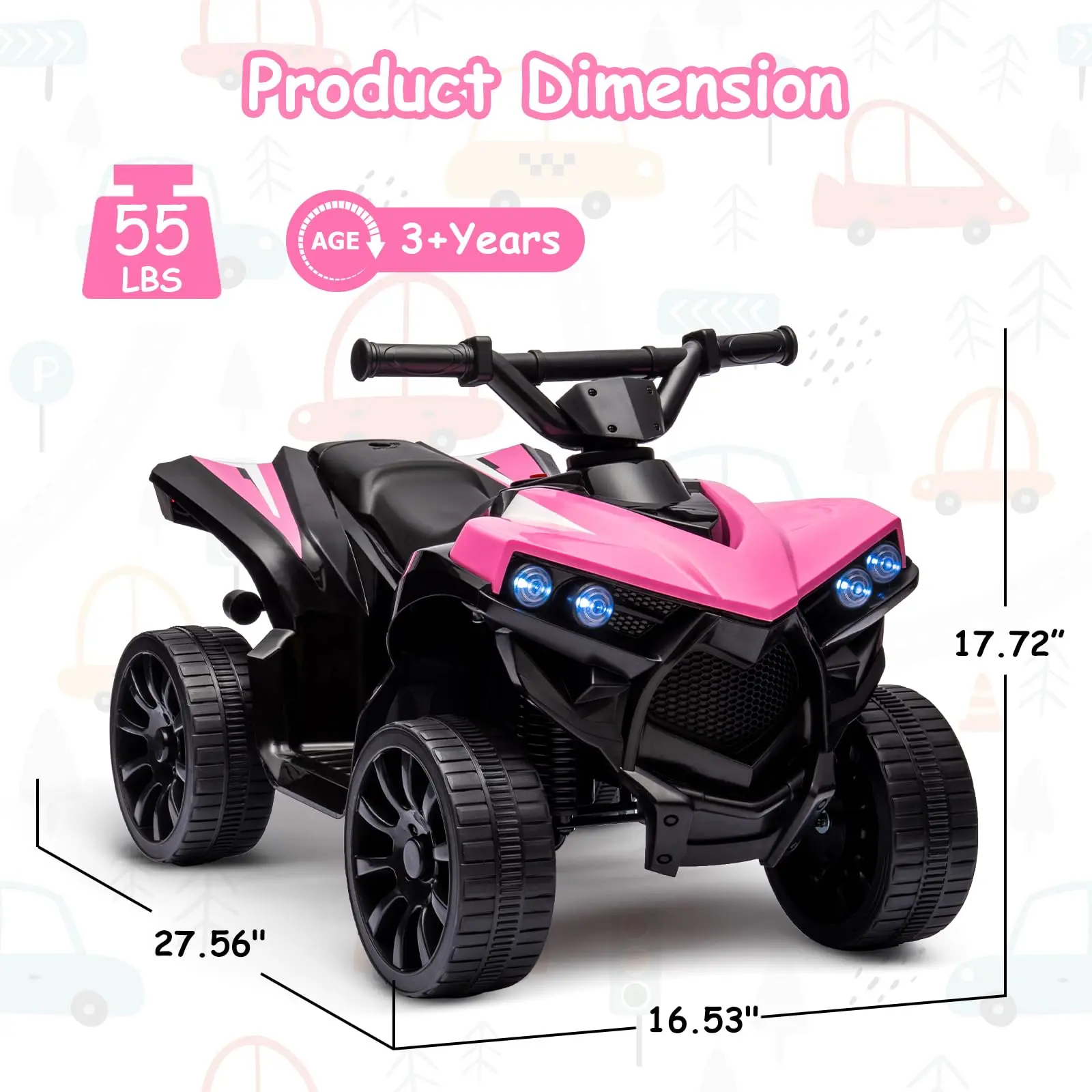 PERFECT GIFT FOR KIDS: The ride on toy for big kids is made of durable PP material and is ASTM certified to ensure its reliability. The four Wheeler Electric Quad is a trustworthy and good companion for kids. Dimensions: 27.56"(L) x 16.53"(W) x 17.72"(H)
