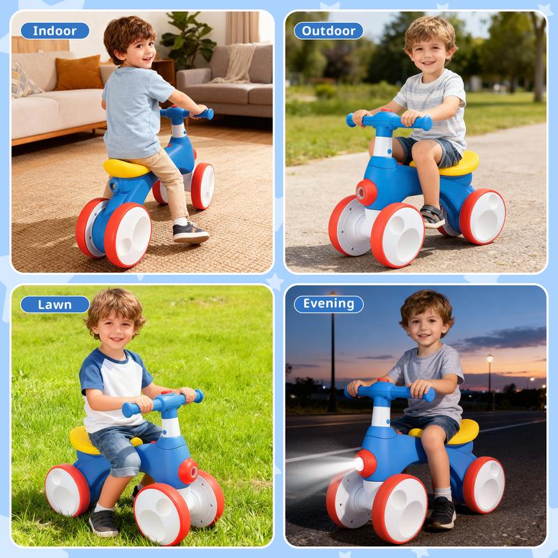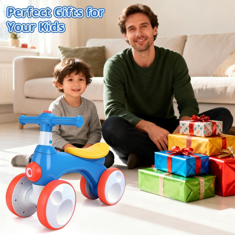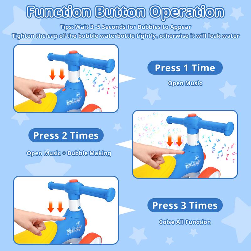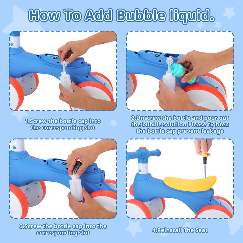 Introducing the perfect toy for your child's first steps! This non-pedal walker features a bubble function and music, making it an exciting ride. It's designed for both indoor and outdoor use, ensuring safety and fun. The bike includes 4 wheels, enhancing stability and fun. A whistle is included, adding an extra element of play. Ideal as a first birthday gift, this walker helps children learn to balance and ride.