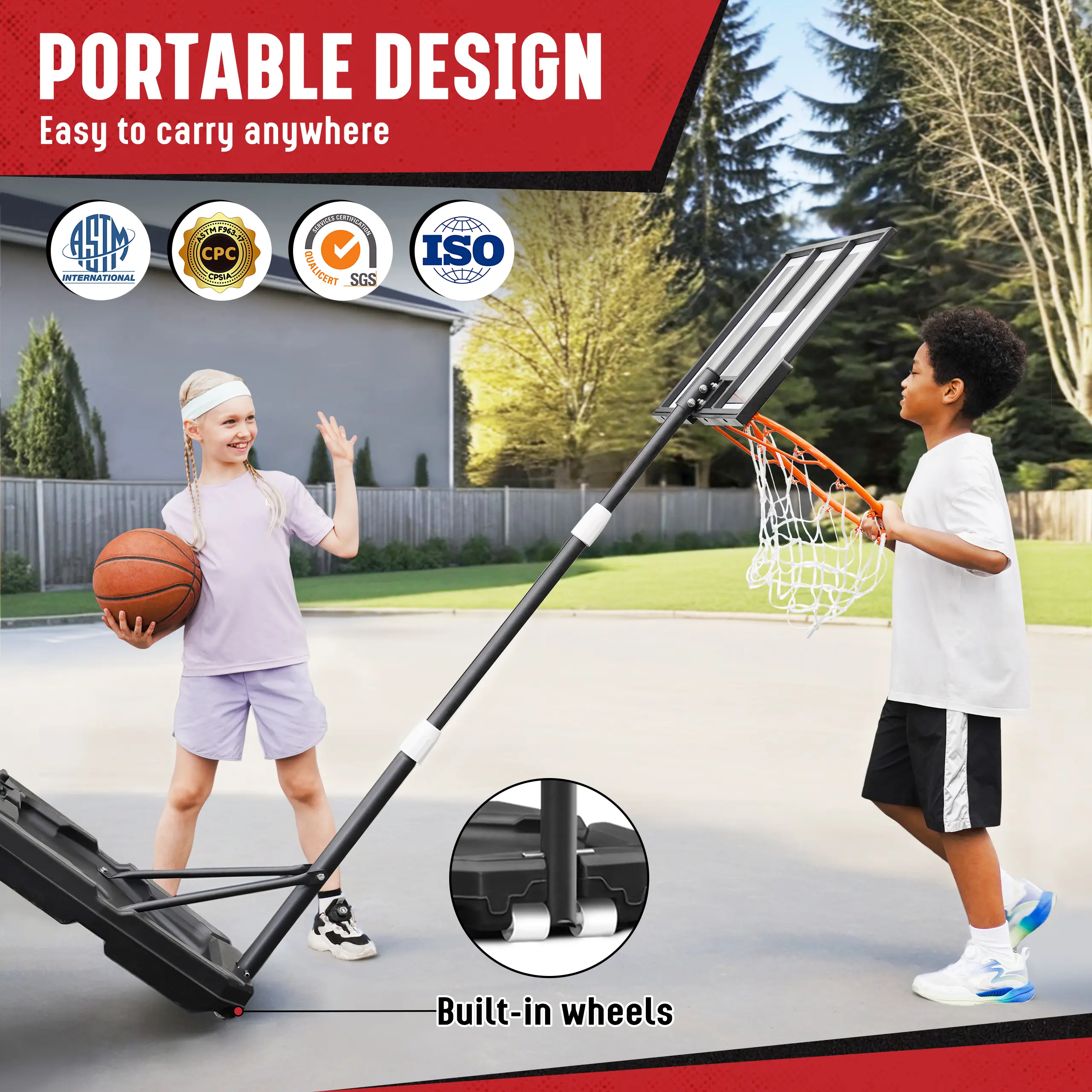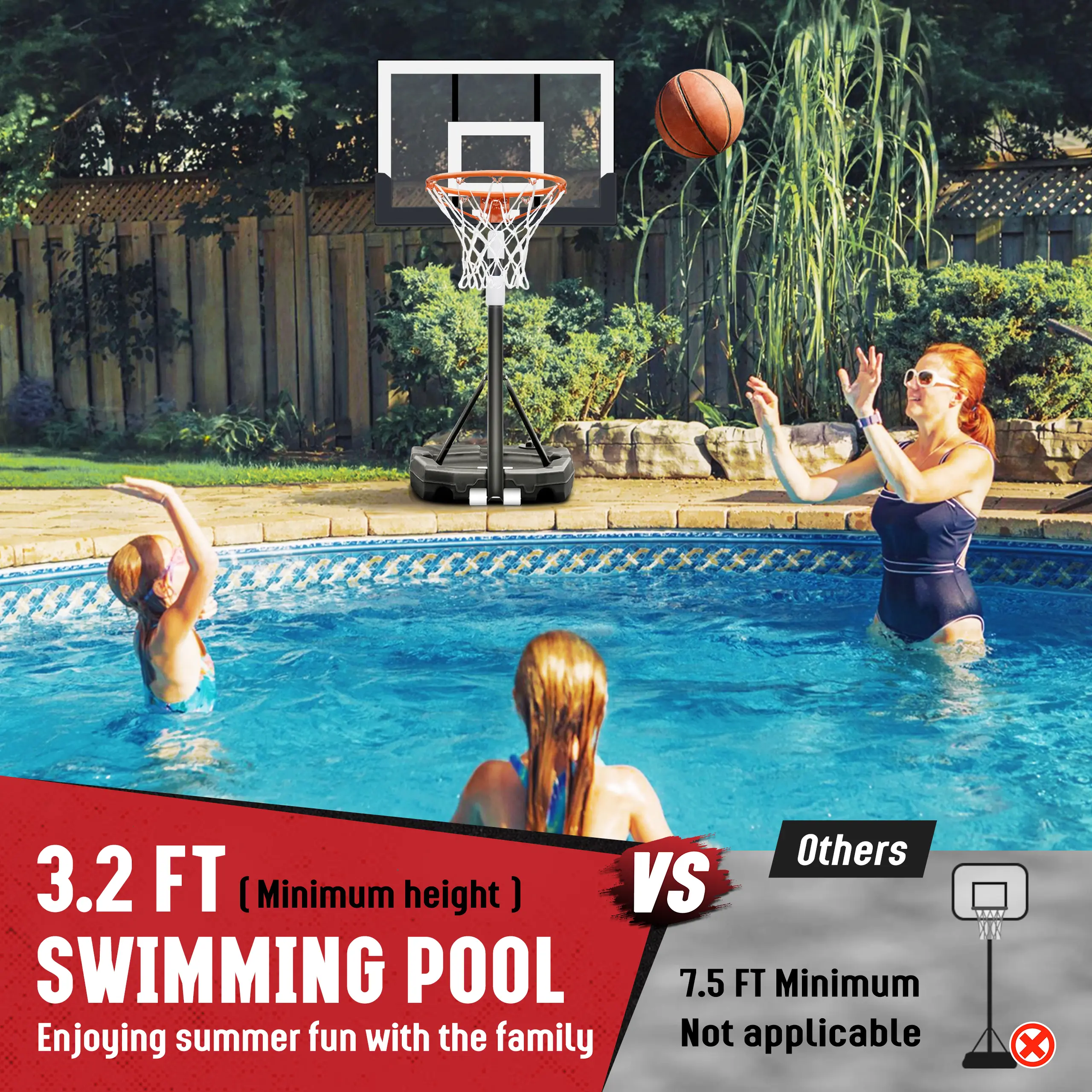 Multiple Scenarios: Set the height to 10 FT for family outdoor playing at the park, your garage or backyard. Lower it to 3.3 FT to become a pool basketball hoop in summer or play it indoors in winter.