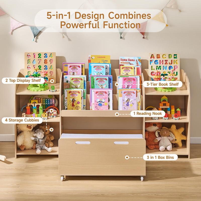 ·5-in-1 Bookcase- Transform your child's space with our multifunctional kid's bookshelf. the bookcase comes with 2 top display storage shelves, 3-tier bookshelf, 4 storage cabinet, 1 kid's storage bench with 3 compartment toy box, the cubby storage organizer creates a pleasant, organized space for books and toys, keeping the room tidy while building a happy reading corner that your child will love
