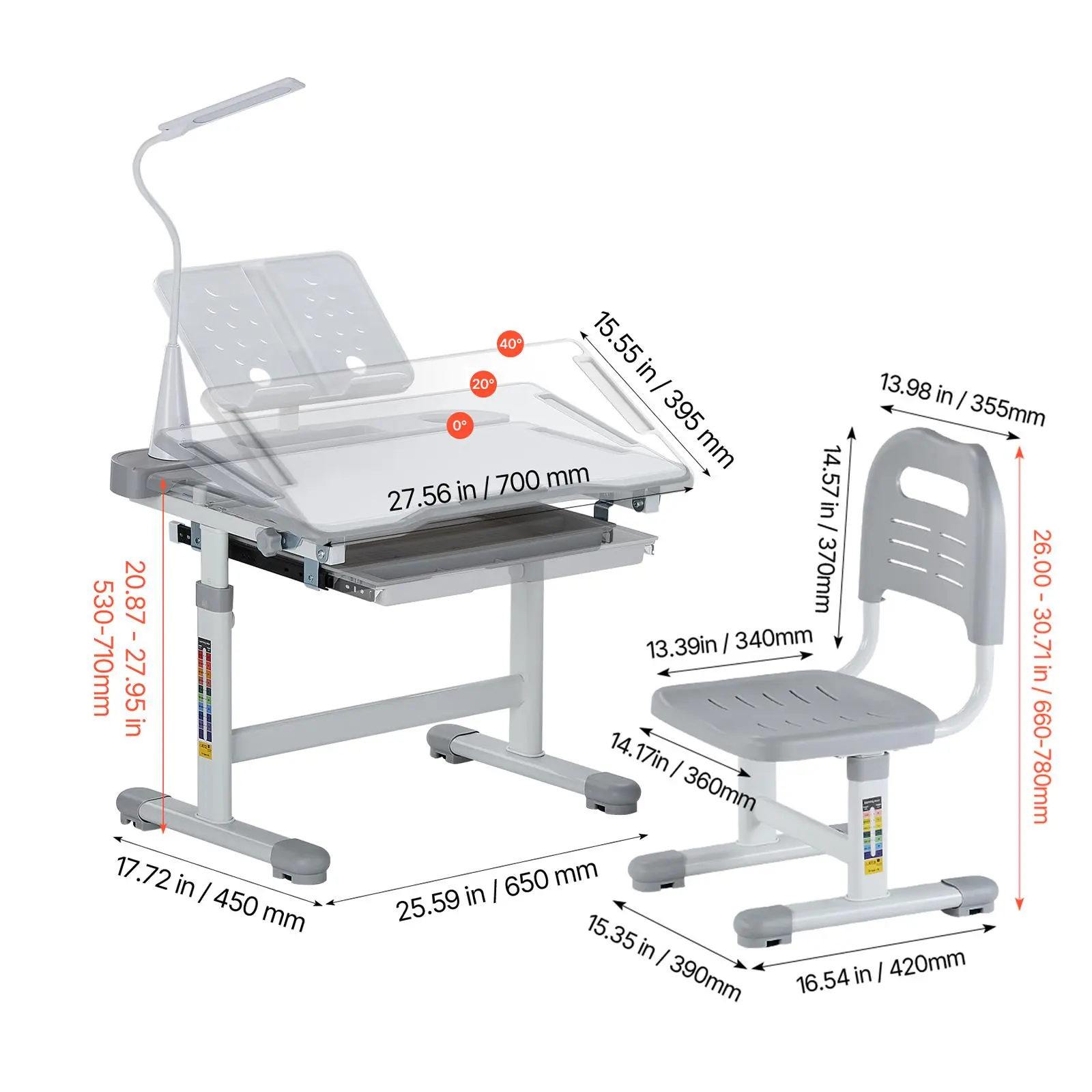 • Adjustable Desktop: Easily tilt the tabletop from 0° to 40°—ideal for writing at 0°, reading at 20°, or drawing at 40°. This flexibility meets various learning activities while helping your child maintain a healthy posture and stay comfortable during study time.