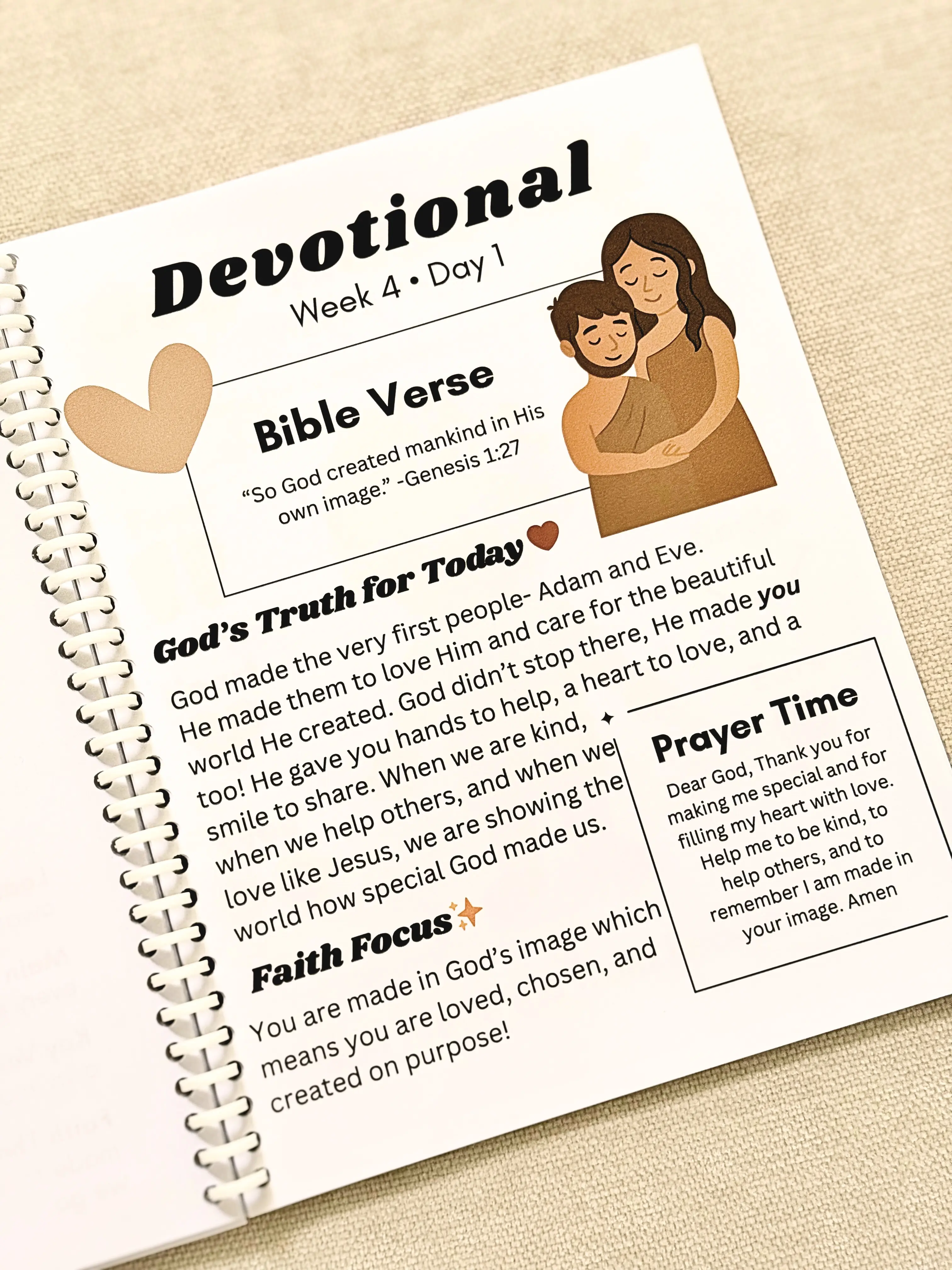 ✨ Help your child grow in faith with this 4-week Christian devotional activity book! Designed for kids, this engaging workbook combines Bible lessons, interactive activities, and reflection prompts. Perfect for Sunday school, homeschooling, or family devotion time. 📖