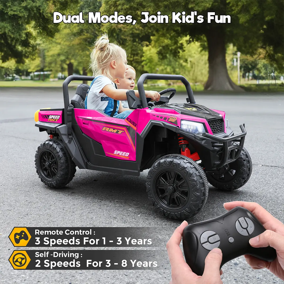 Kids drive independently (2 speeds) or parents guide safely via 2.4GHz remote with 3 speeds & instant stop.