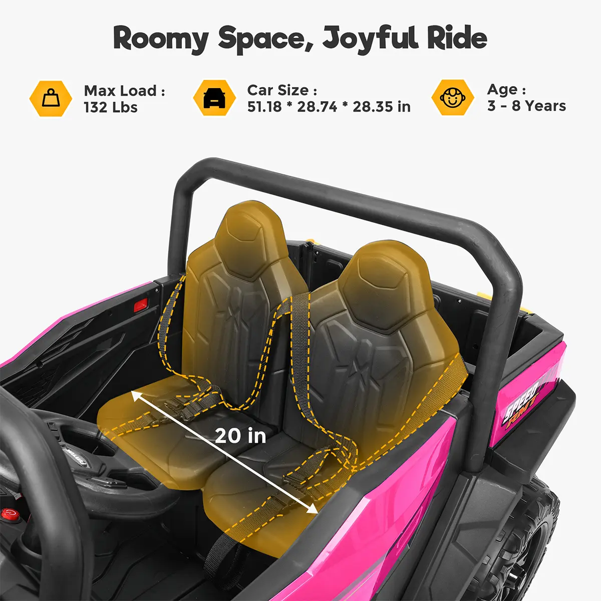 Roomy 20-inch seats fit two children (132 lbs total) with adjustable seat belts for shared fun.