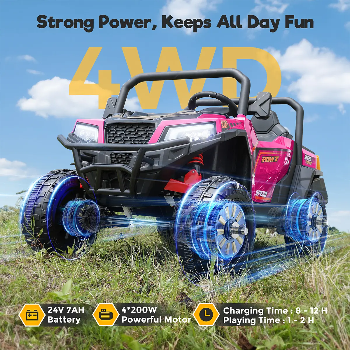 4×200W motor reaches 5 MPH with 4WD/2WD switching. Handles various terrains while optimizing battery life.