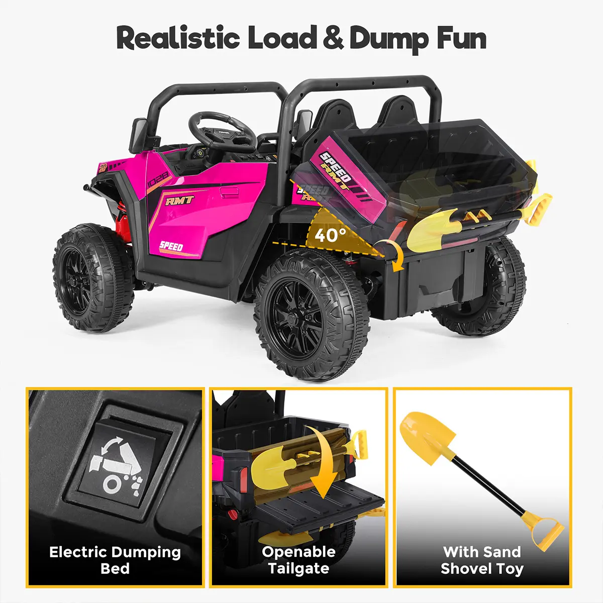Electric auto-lift dump bed loads and dumps with button control. Includes iron pipe toy shovel for realistic play and transport adventures.