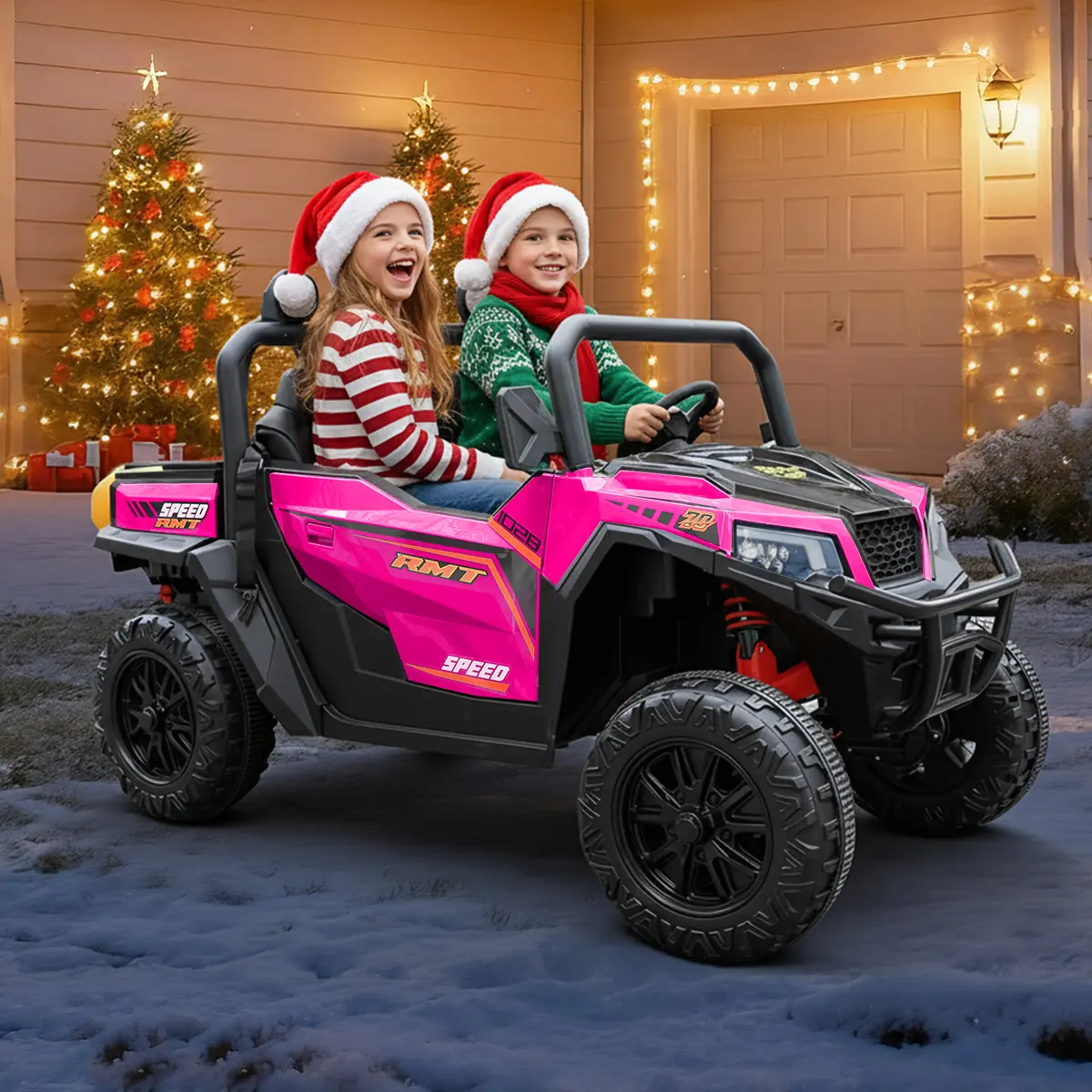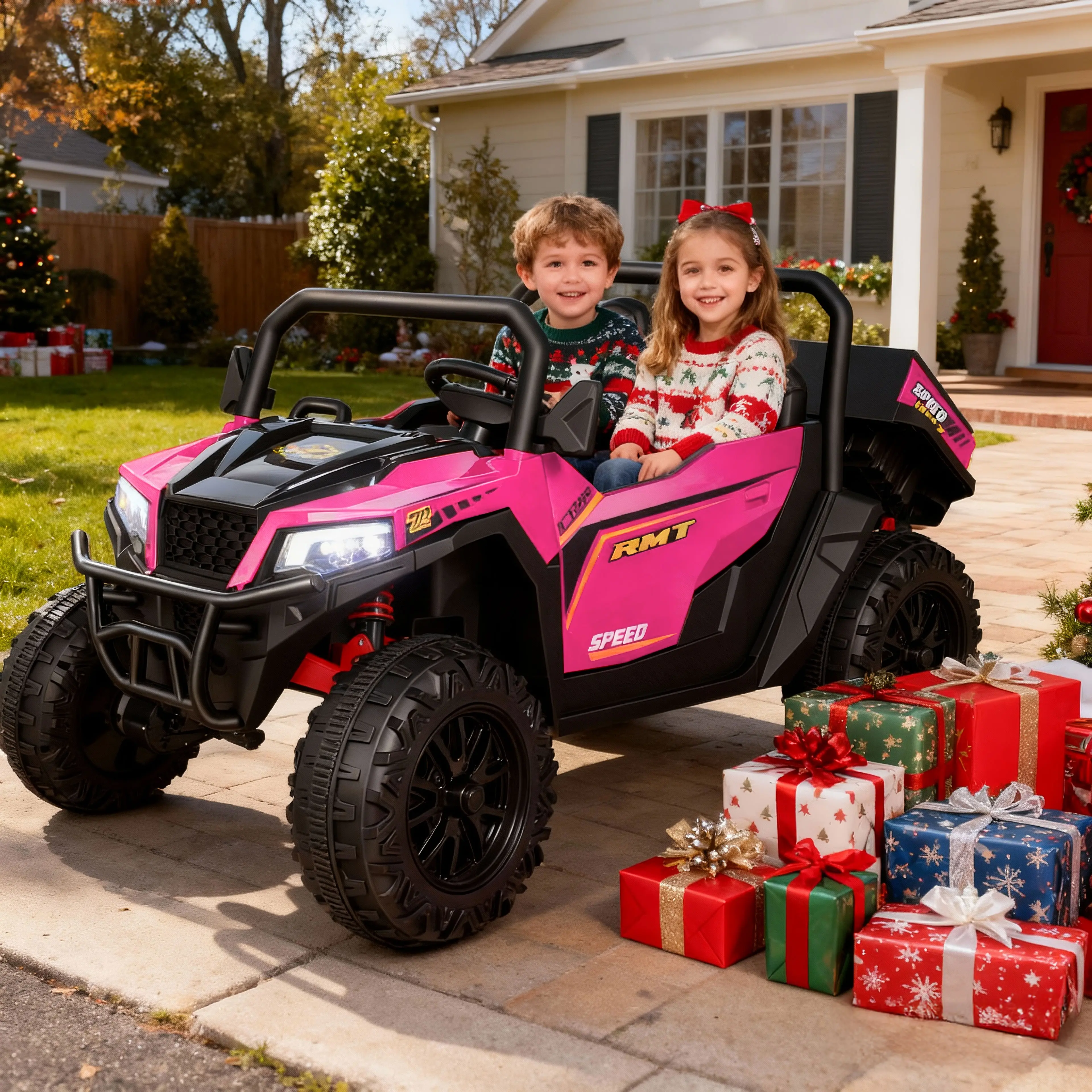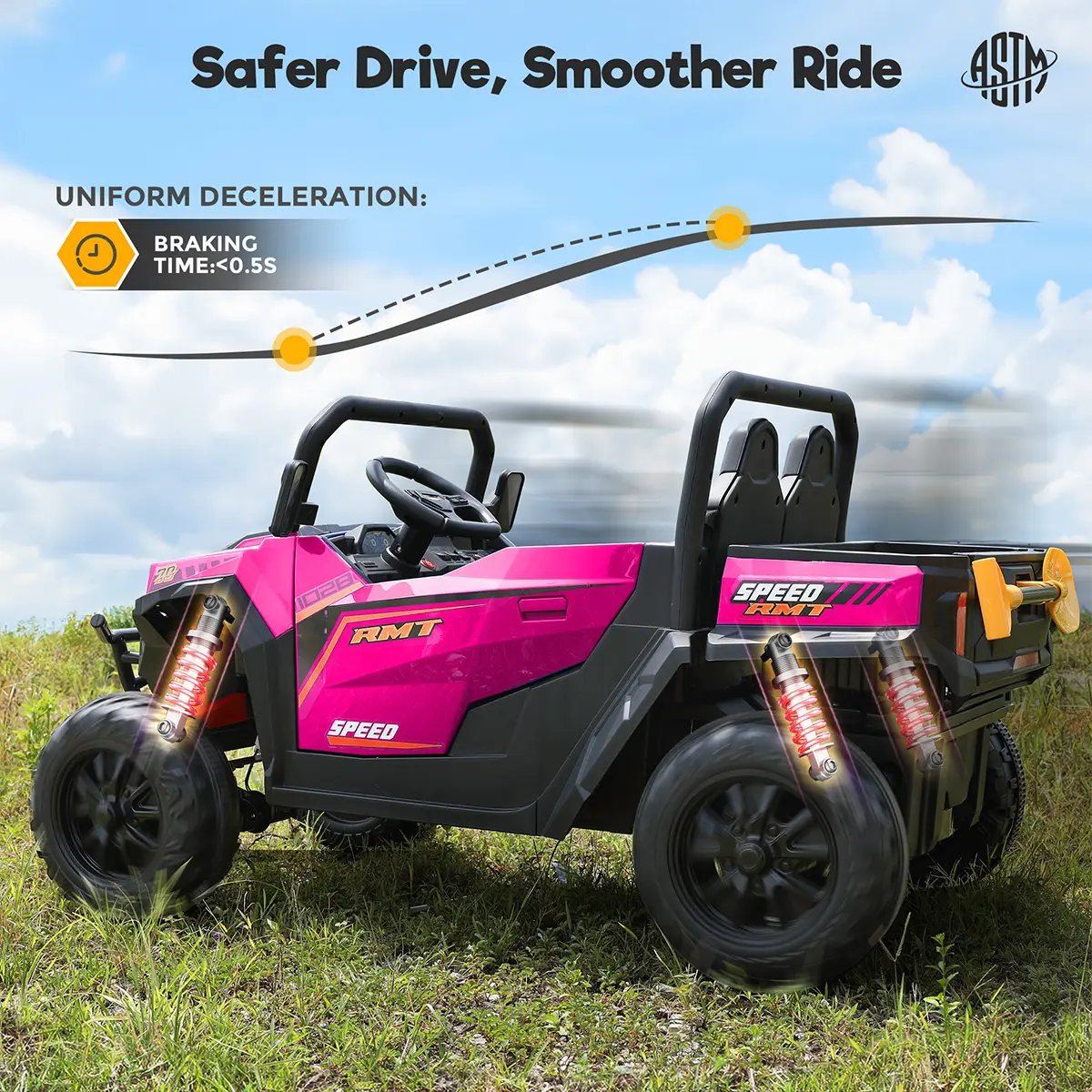 CPSC & ASTM certified with soft-start system, 4-wheel spring suspension, non-slip tires, 3-point safety belts, and double-lock doors for maximum protection.