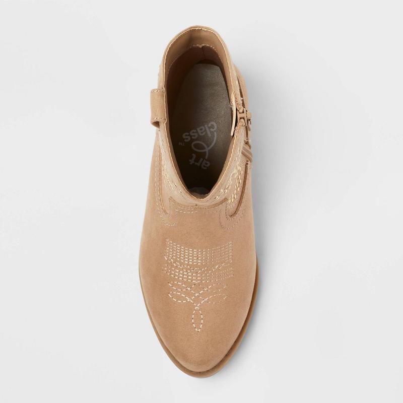 Update your child's shoe collection with these Elma Studded Western Boots from art class. These mid-calf boots boast a faux-suede upper, almond-shaped toe, and soft insole and lining. Set on a 1.25-inch western heel, the solid-color boots are elevated by a curved topline, stylish pull loops and ornate gold-tone studding and embroidery on the vamp and shaft. A side zipper completes the look and lends a snug fit with easy on and off.