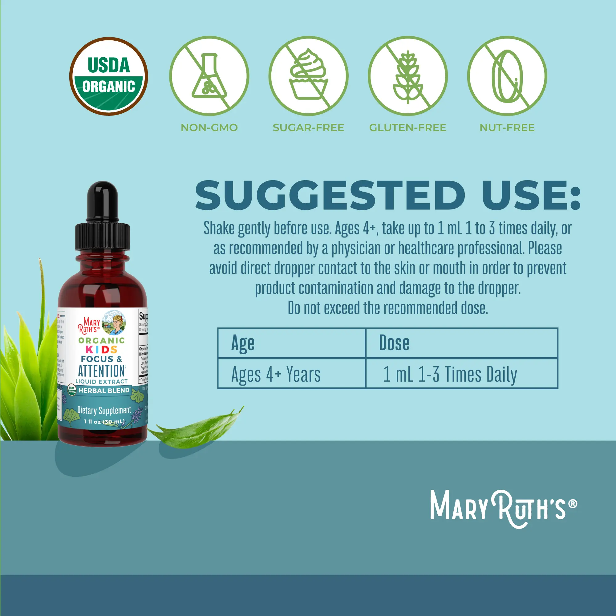 For Most Lifestyles: MaryRuth's Kids Focus Attention Liquid Drops are USDA Organic, Non-GMO, vegan, Made in a GMP (Good Manufacturing Practice) Facility. Dairy free, nut free, gluten free, soy free, sugar free, kid friendly. Clean Label Project Certified. B Corp Certified.
