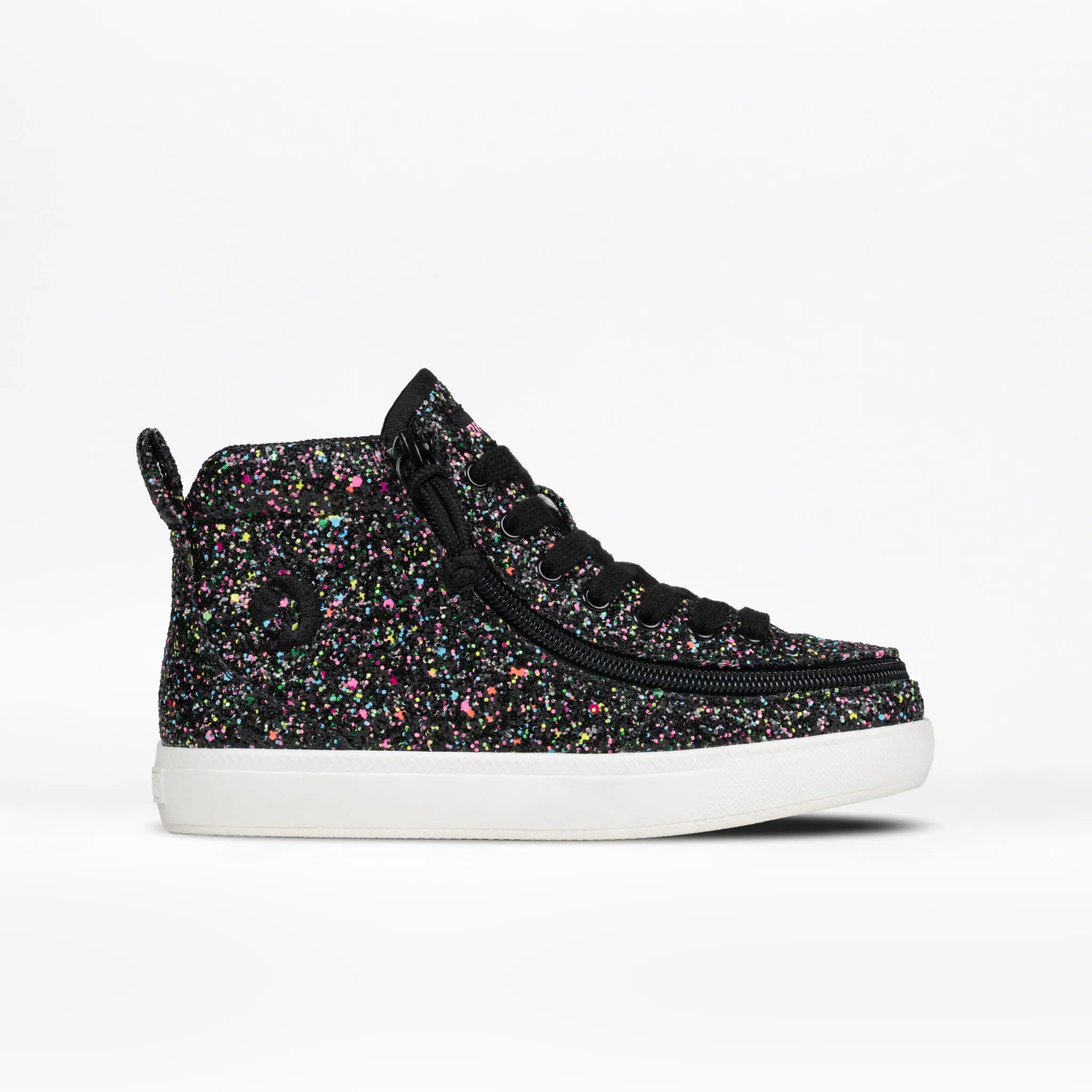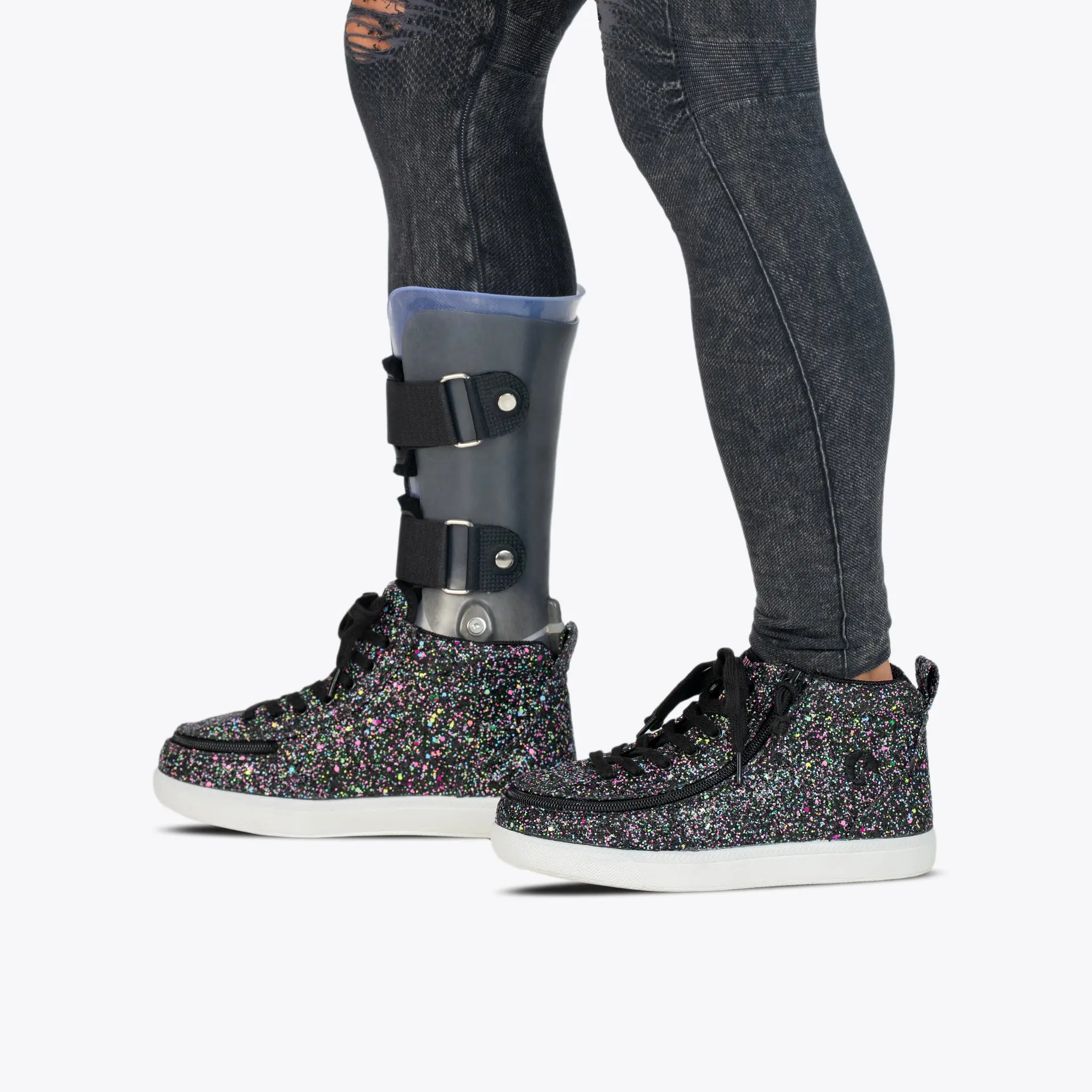 Built around a custom shape to better accommodate braces, orthotics, and prosthetics, the Kids'/Toddler Glitter BILLY Classic D|R II High is one of our most AFO-friendly designs. Coupled with removable insoles for increased depth and a robust inner shoe lining for added durability, it's a great solution for many.
