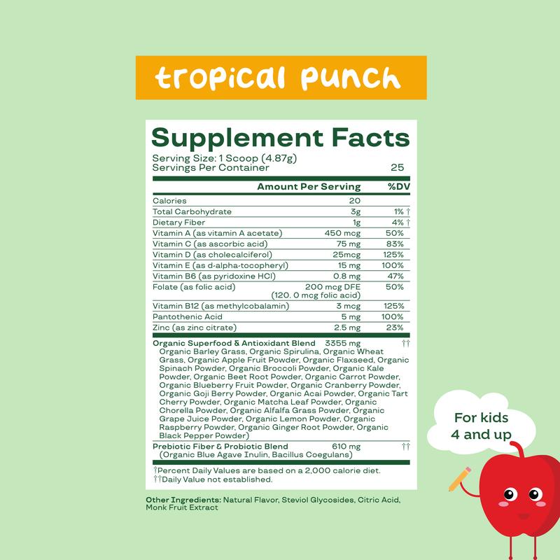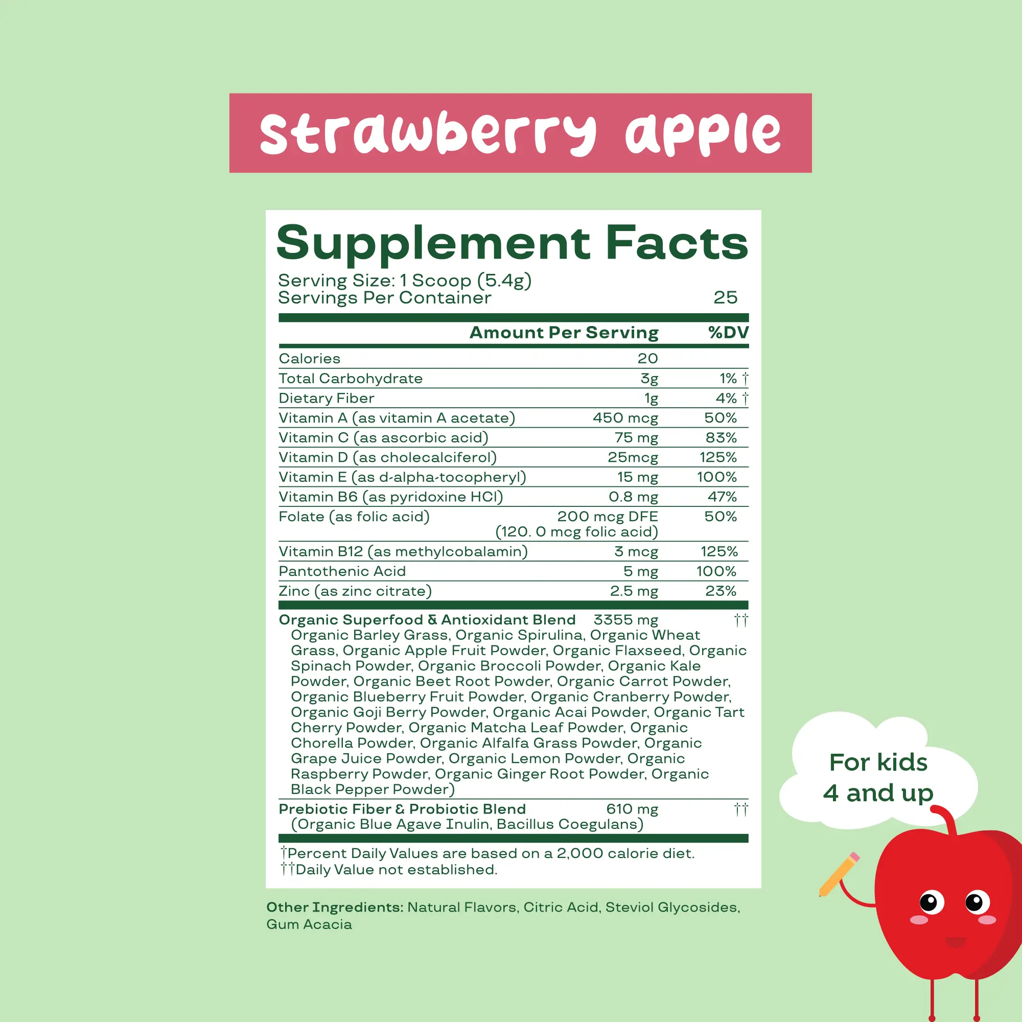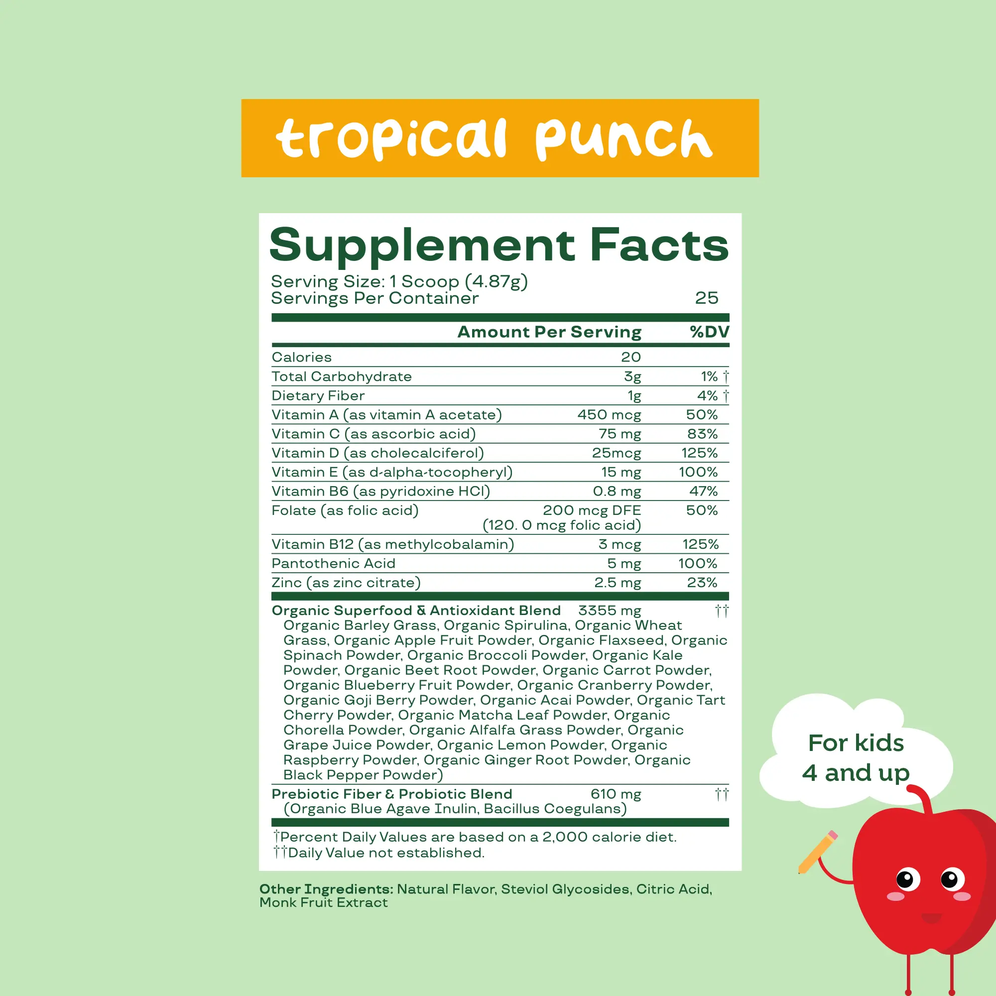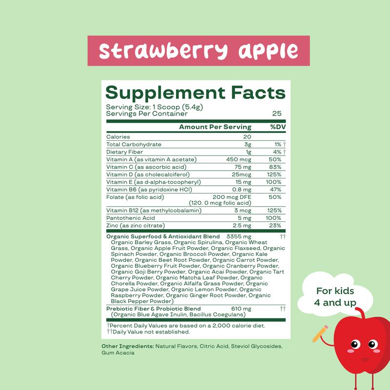 ·Scientifically Formulated: Made with 20+ fruits and veggies, including vitamins A, B, C, D, and Z, and probiotics, this powder is scientifically formulated to support your child's overall health.