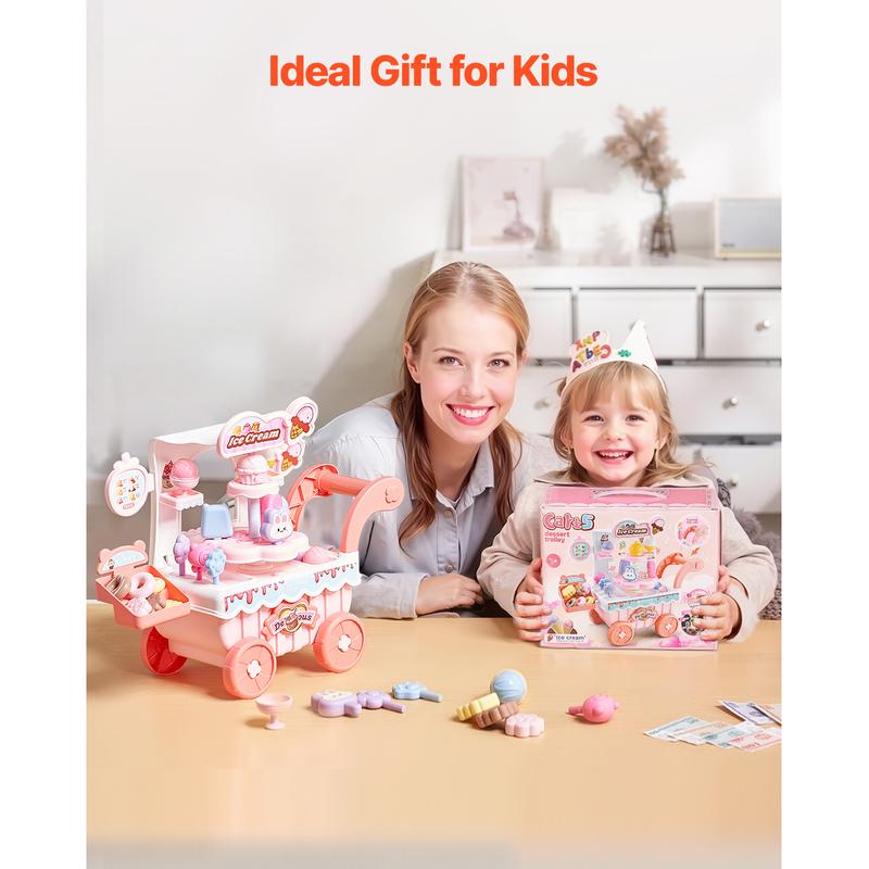 VEVOR Ice Cream Cart for Kids, 27 PCS Accessories, Pretend Play Store with Storage Trolley with Pretend Money, Sound & Light Effects, Montessori Educational Ice Cream Truck Toys for Toddlers 3+ (Pink)