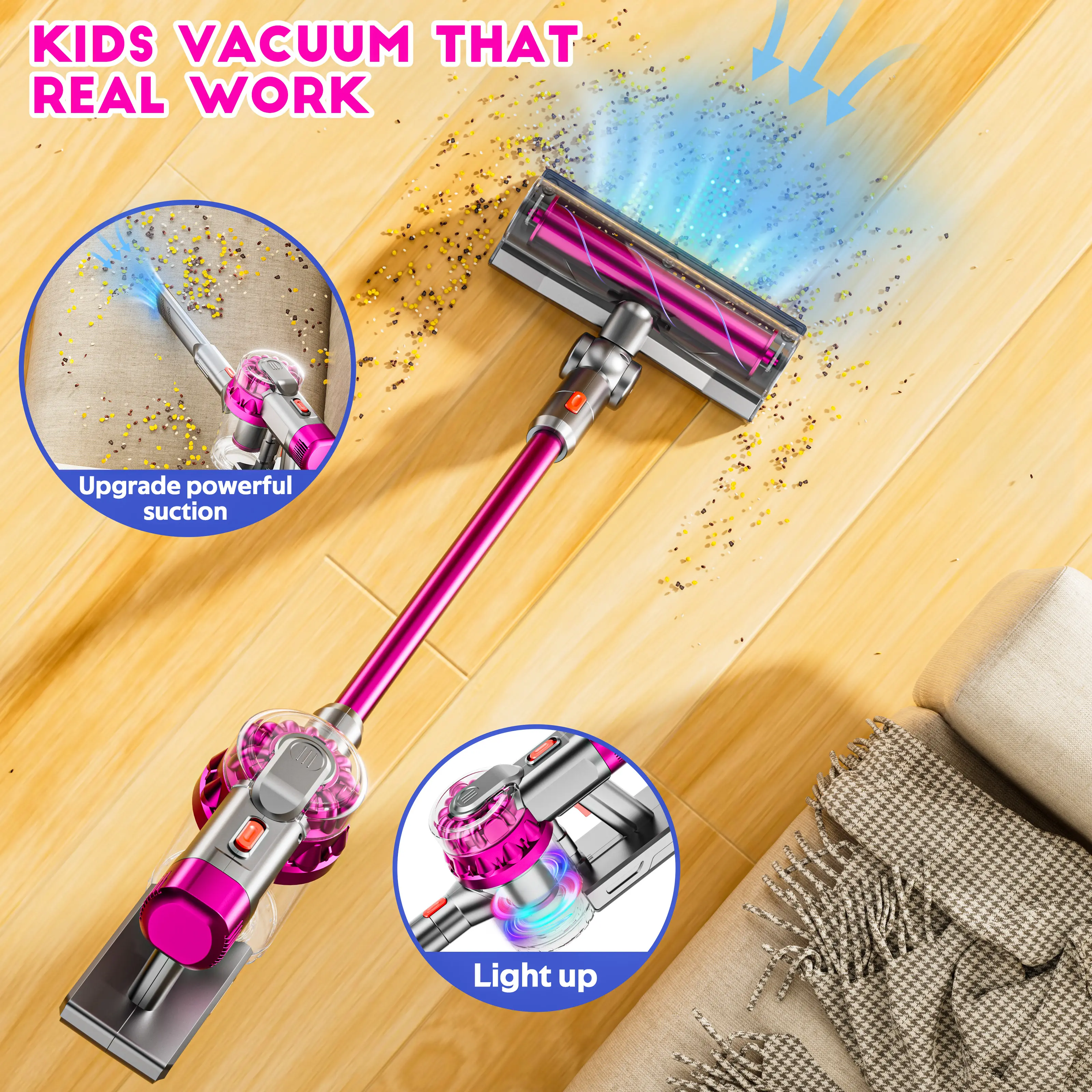 Maybe I was expecting too much but I am not too pleased with this product. I have a 7yr old who I am trying to teach to pick up so I thought perfect! But the suction is weak and the hole for the suction is way too small. It’s a good toy but not what they sell it as which is a working vacuum for kids. I gave it 3 stars because it is easy to assemble and pretty looking.