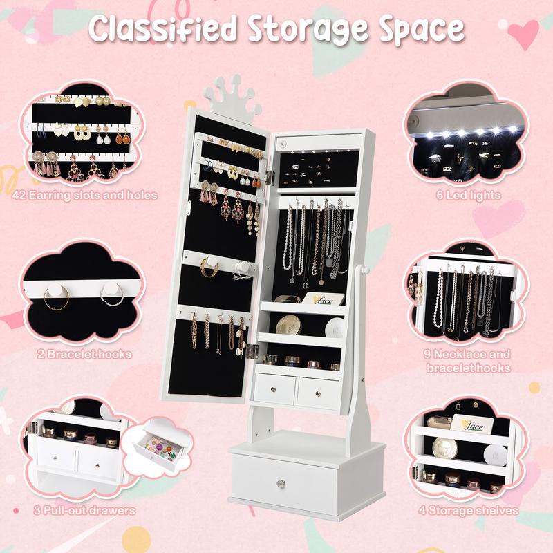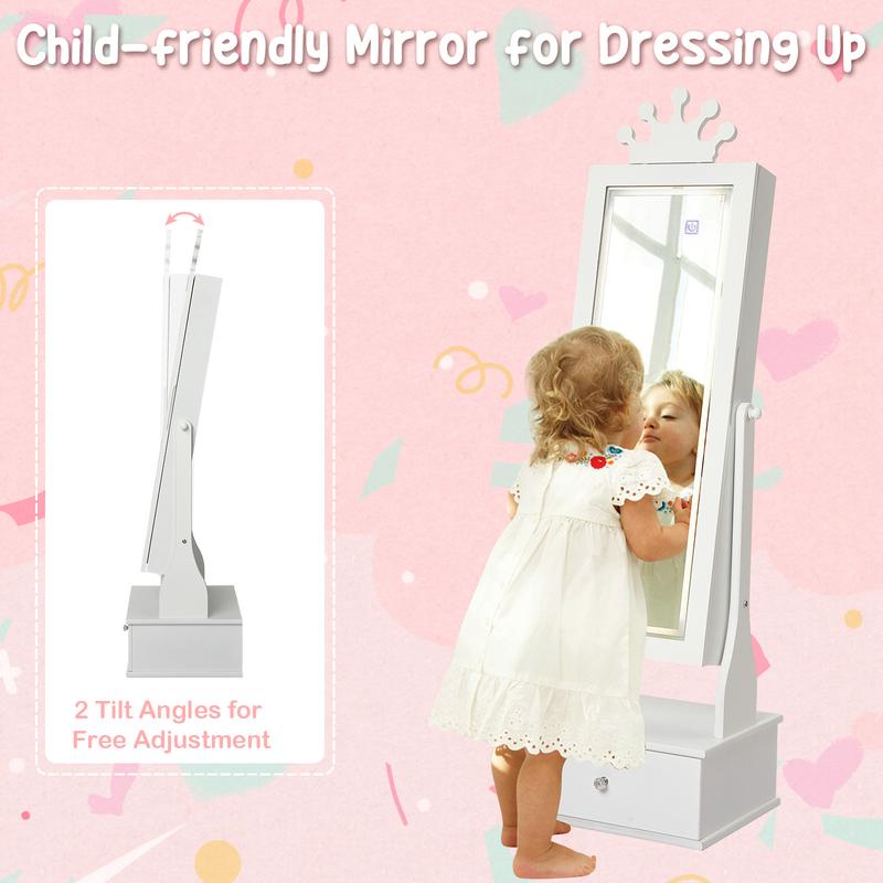 ·Full-length Mirror with LED: Measuring 28" x 8" in size, this stunning full-length mirror allows your kids to see their outfit from head to toe. And the 2-level tilt adjustment is convenient for them to find the perfect viewing angle. The kids mirror jewelry organizer will illuminate your space from the inside to the outside. The exterior is a comprehensive mirror with LED light band designed by touch screen, and the interior is equipped with 6 LED atmosphere lights.