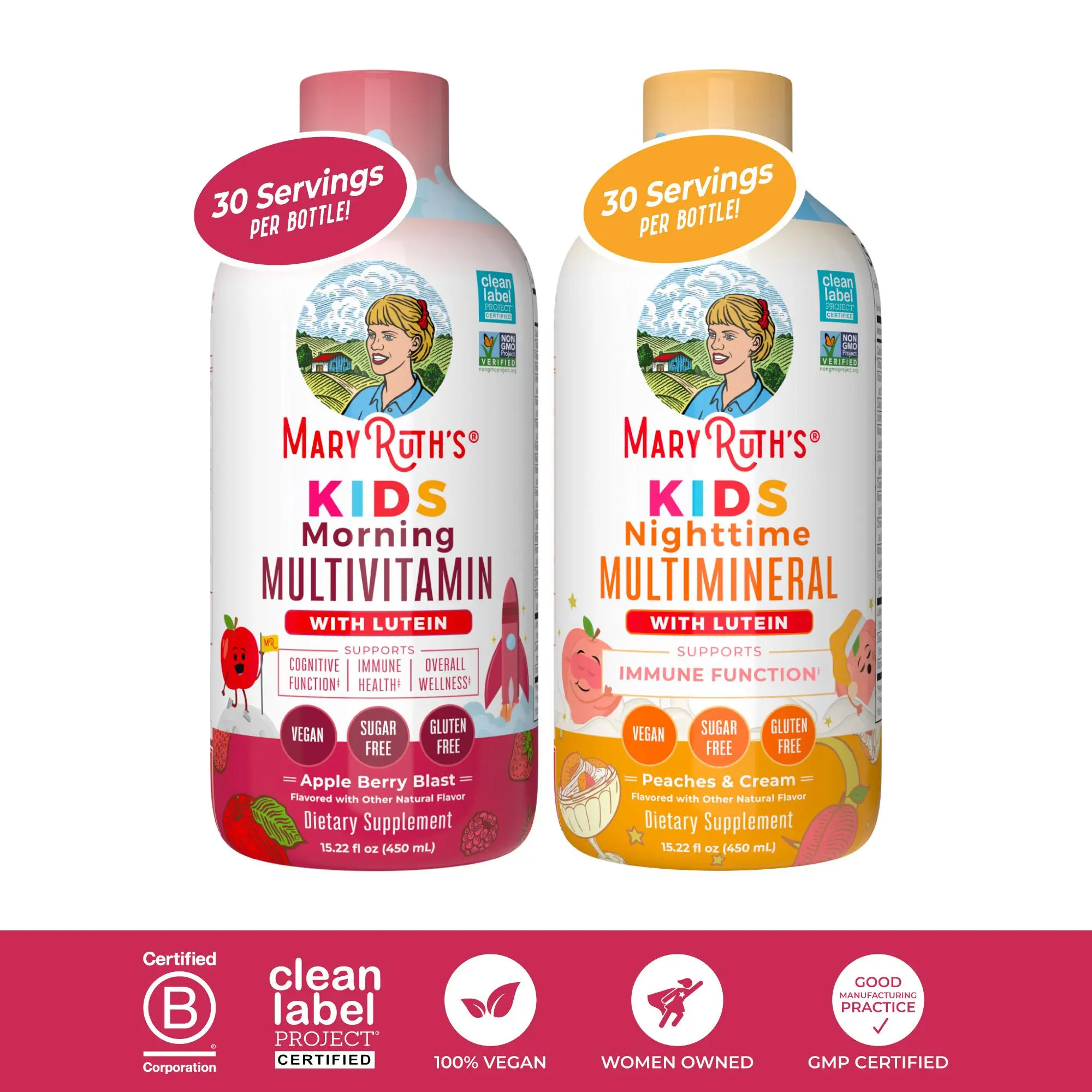 For Most Lifestyles: MaryRuth's Kids Morning Multivitamin is Non-GMO Project Verified, BeVeg Certified, Vegan, Made in a GMP Facility. Dairy Free, Nut Free, Gluten Free, Sugar Free. Formulated For Kids! Clean Label Project Certified. B Corp Certified.