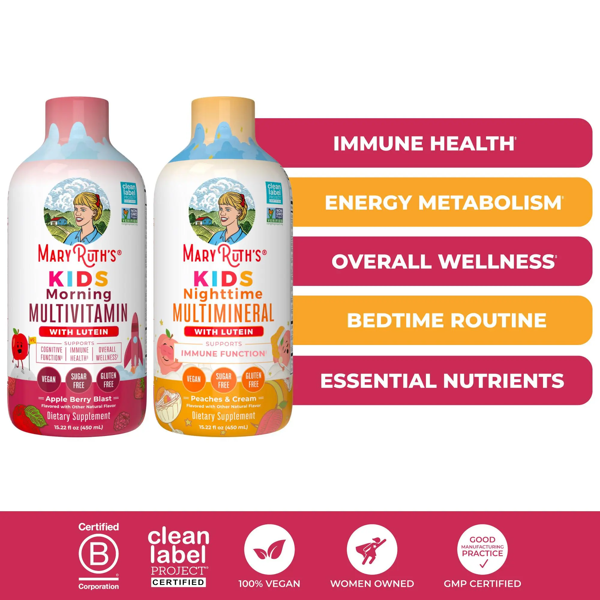 For Most Lifestyles: MaryRuth's Kids Nighttime Multimineral is Non-GMO Project Verified, BeVeg Certified, Vegan, Made in a GMP Facility. Dairy Free, Nut Free, Gluten Free, Sugar Free. Formulated For Kids! Clean Label Project Certified. B Corp Certified.