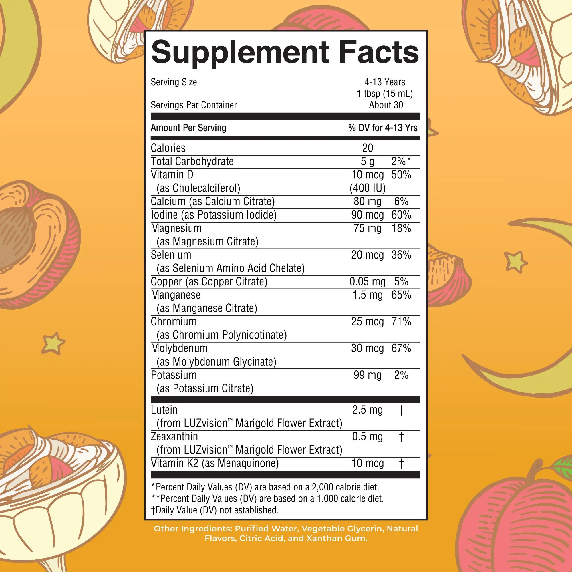 Kids Vitamins: In just one serving per day, your child will receive vitamins A, C, D, E, K, thiamin, riboflavin, niacin, vitamin B6 folate, vitamin B12, biotin, pantothenic acid, choline, zinc, potassium, and lutein.