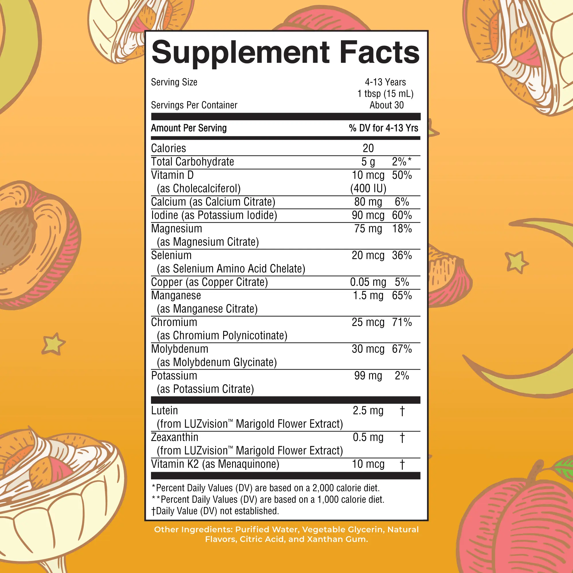 Kids Vitamins: In just one serving per day, your child will receive vitamins A, C, D, E, K, thiamin, riboflavin, niacin, vitamin B6 folate, vitamin B12, biotin, pantothenic acid, choline, zinc, potassium, and lutein.